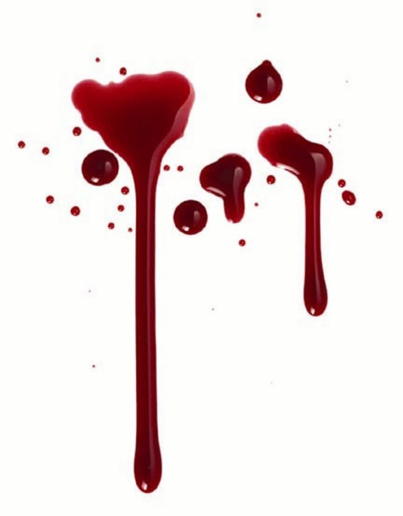 Description: A blood dripping down the side of a white wall with red drops of blood on it and a white background.
