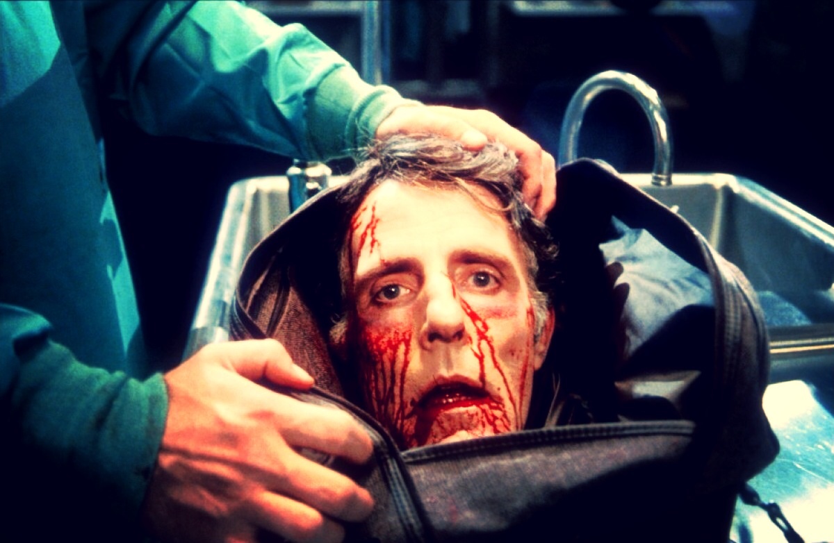 Description: A man with blood on his face is in a bag with a person holding it over his head and a person holding a bag.