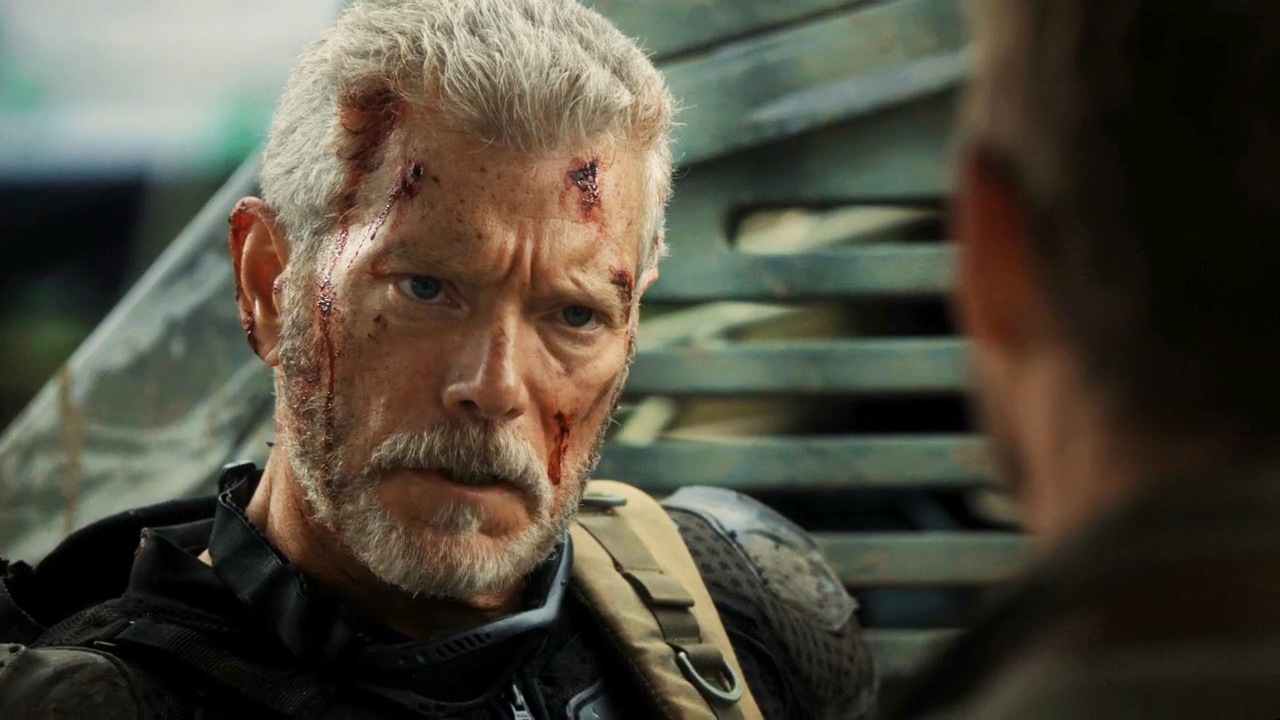 Description: A man with a bloody face and a backpack on his back looking at another man with a knife in his hand.