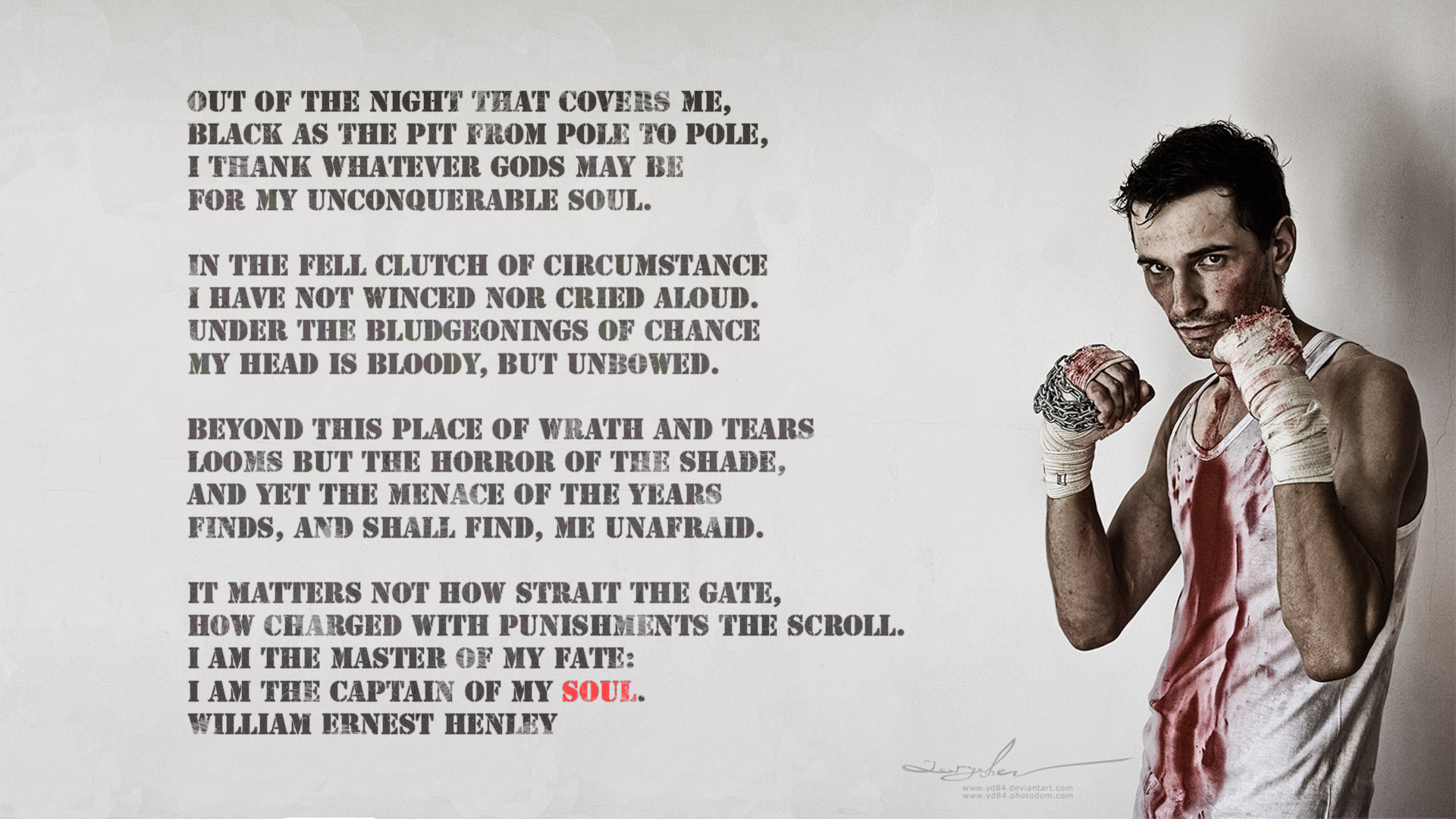 Description: A man with a bloody face and a white shirt holding a glass in his hand and a poem written in the background.