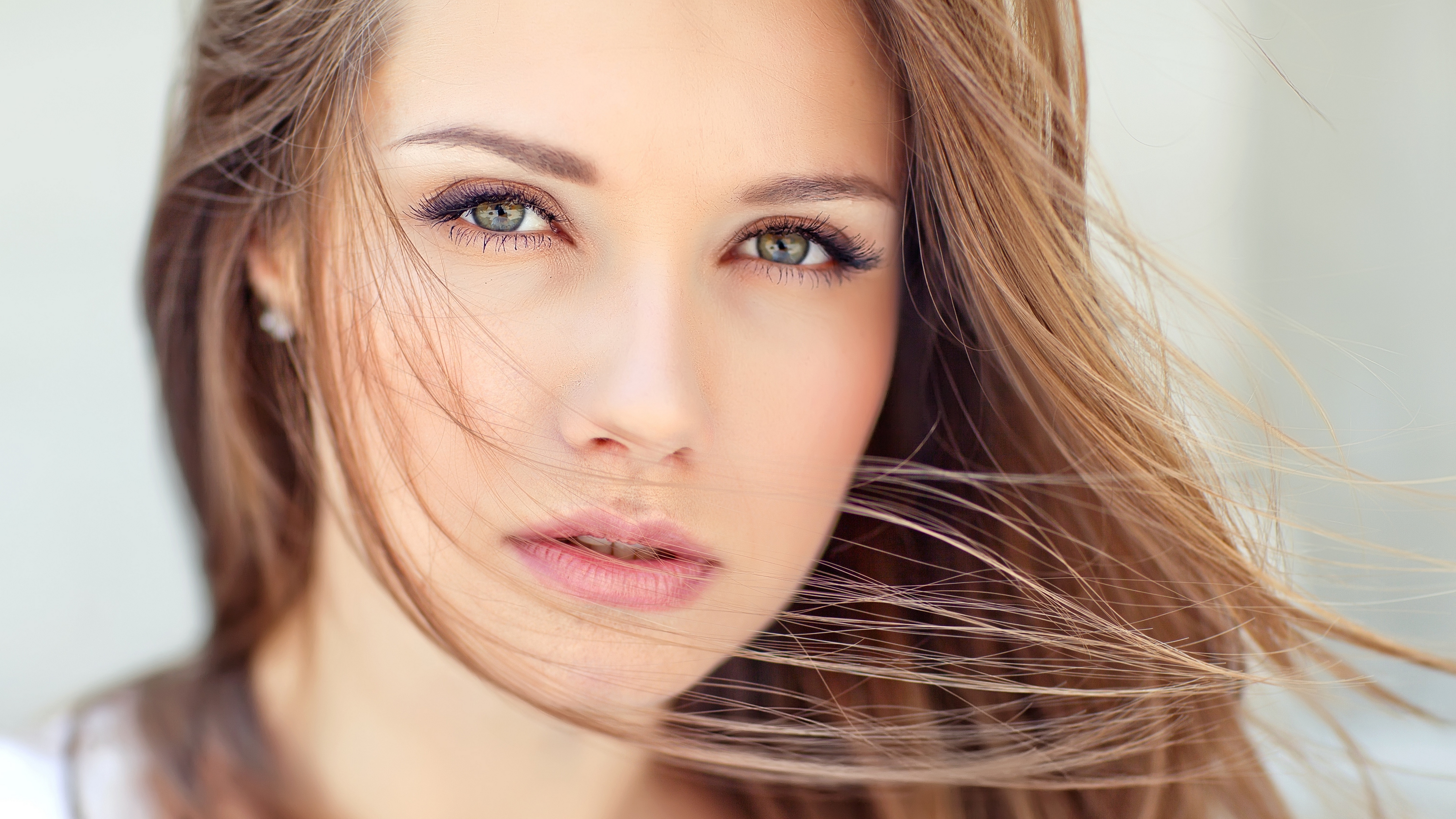 Description: A woman with long hair blowing in the wind with her hair blowing in the wind.