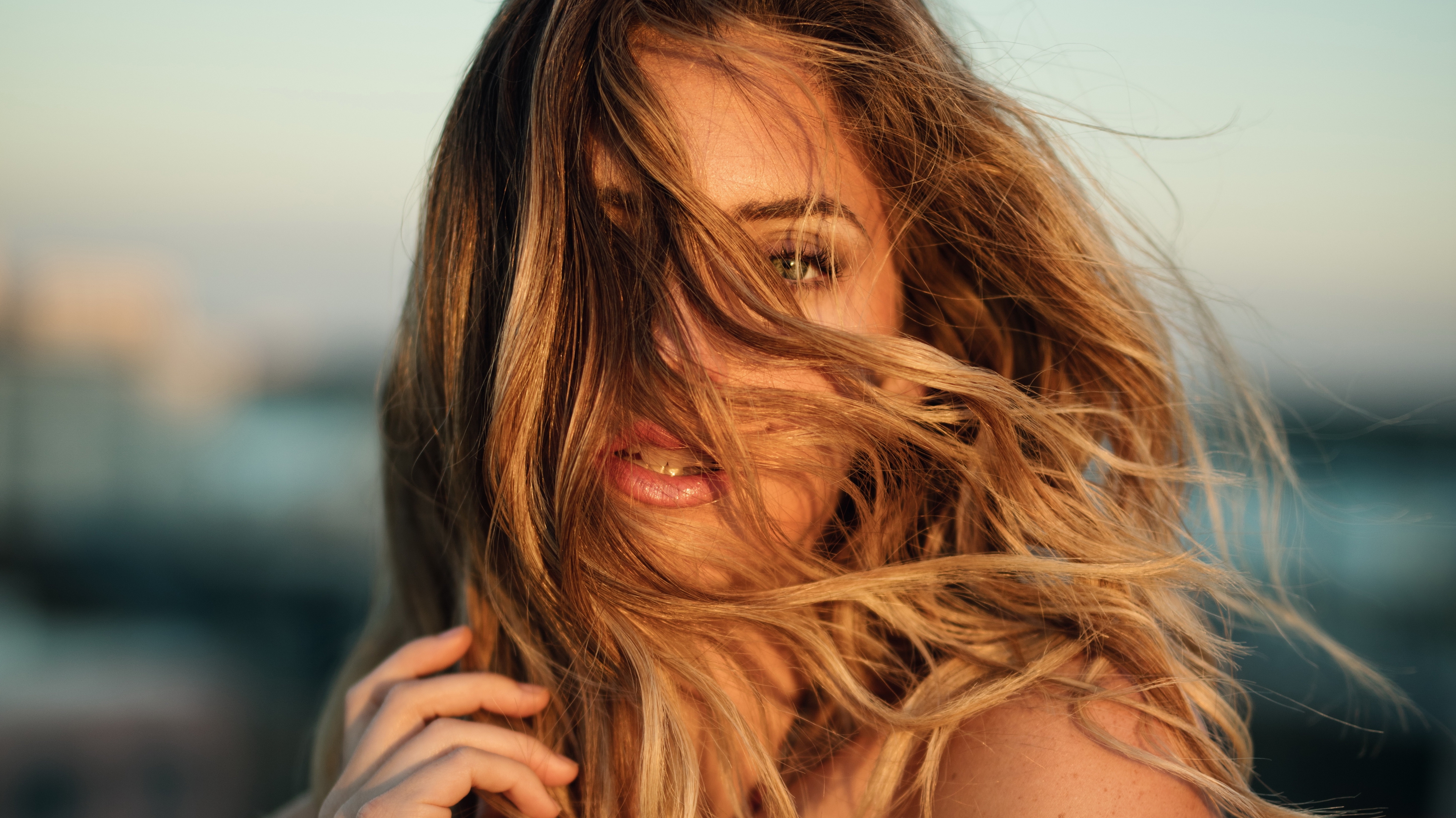 Description: A woman with long hair is posing for a picture with her hair blowing in the wind and her eyes closed.