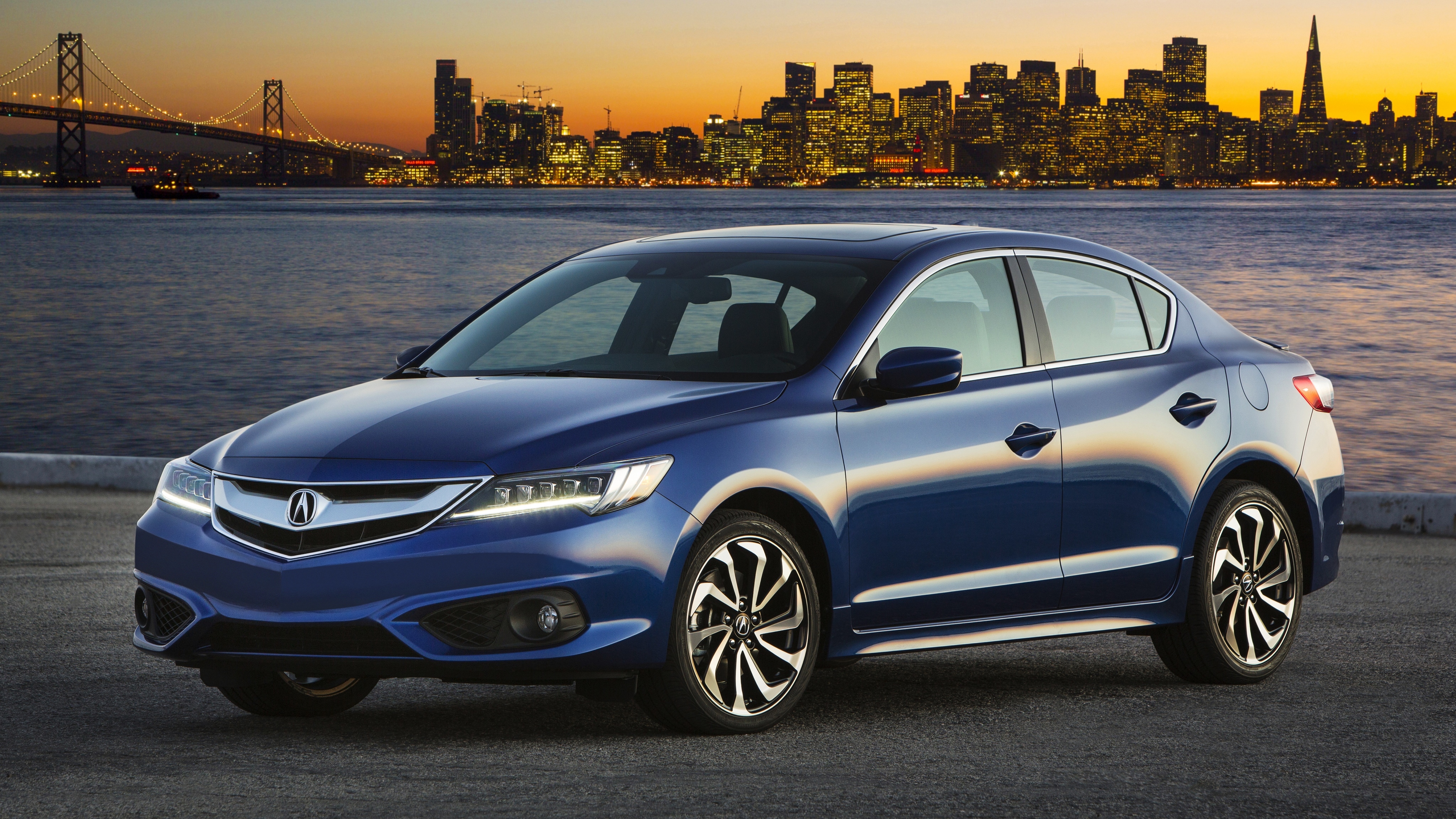 Description: A blue acurace parked in front of a city skyline at sunset with a bridge in the background.