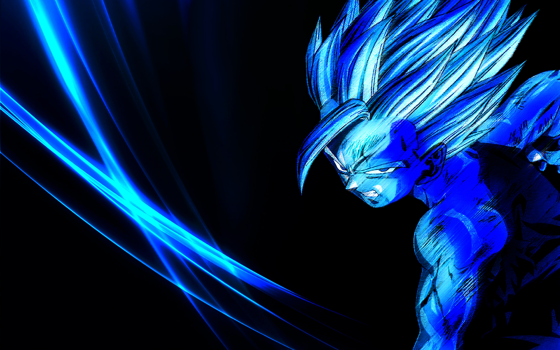 Description: A blue anime character with long hair and a black background with blue lines and lines of light coming from his body.