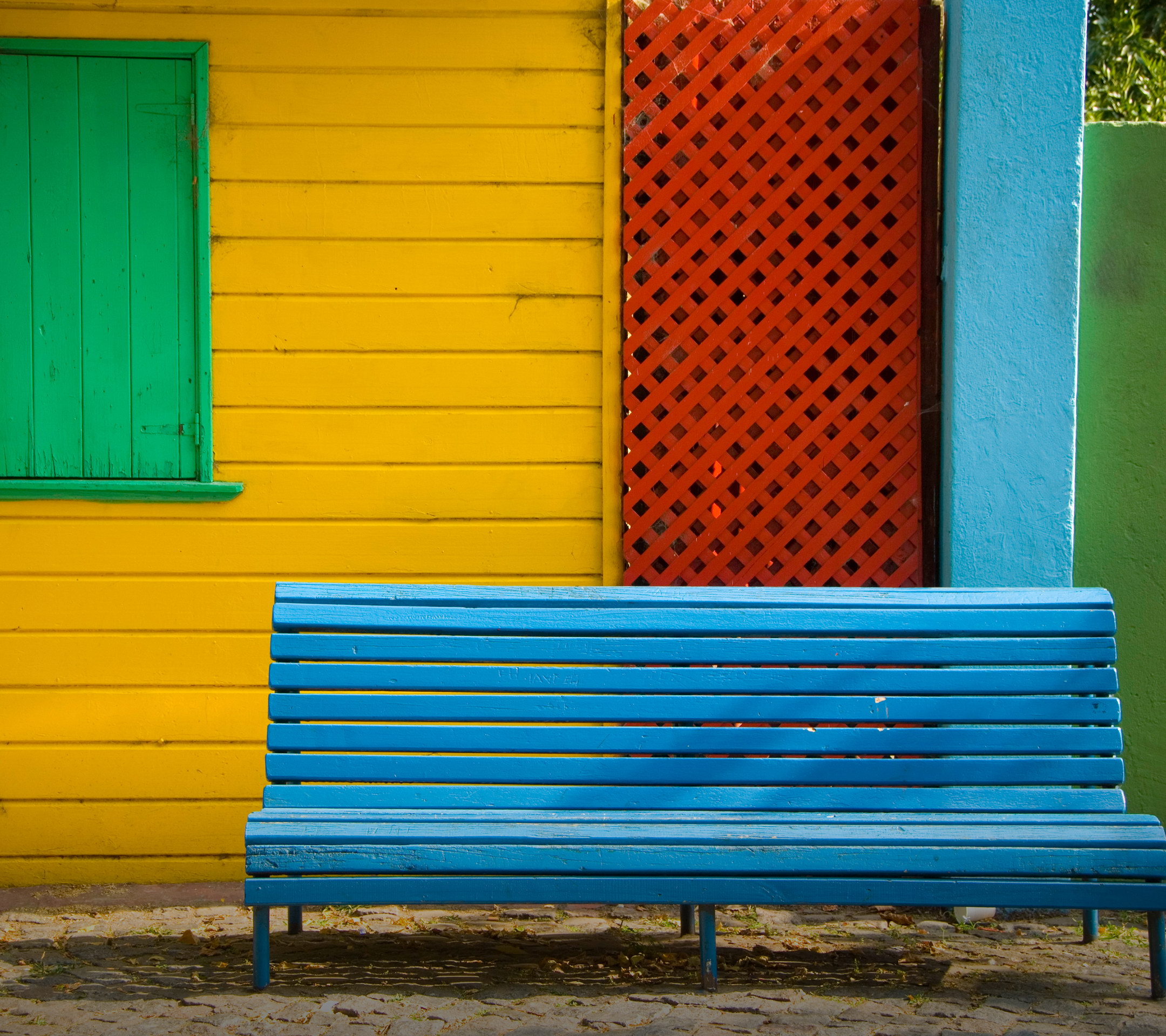 Description: A blue bench sitting in front of a yellow building with green shutters and a red door with a green window.