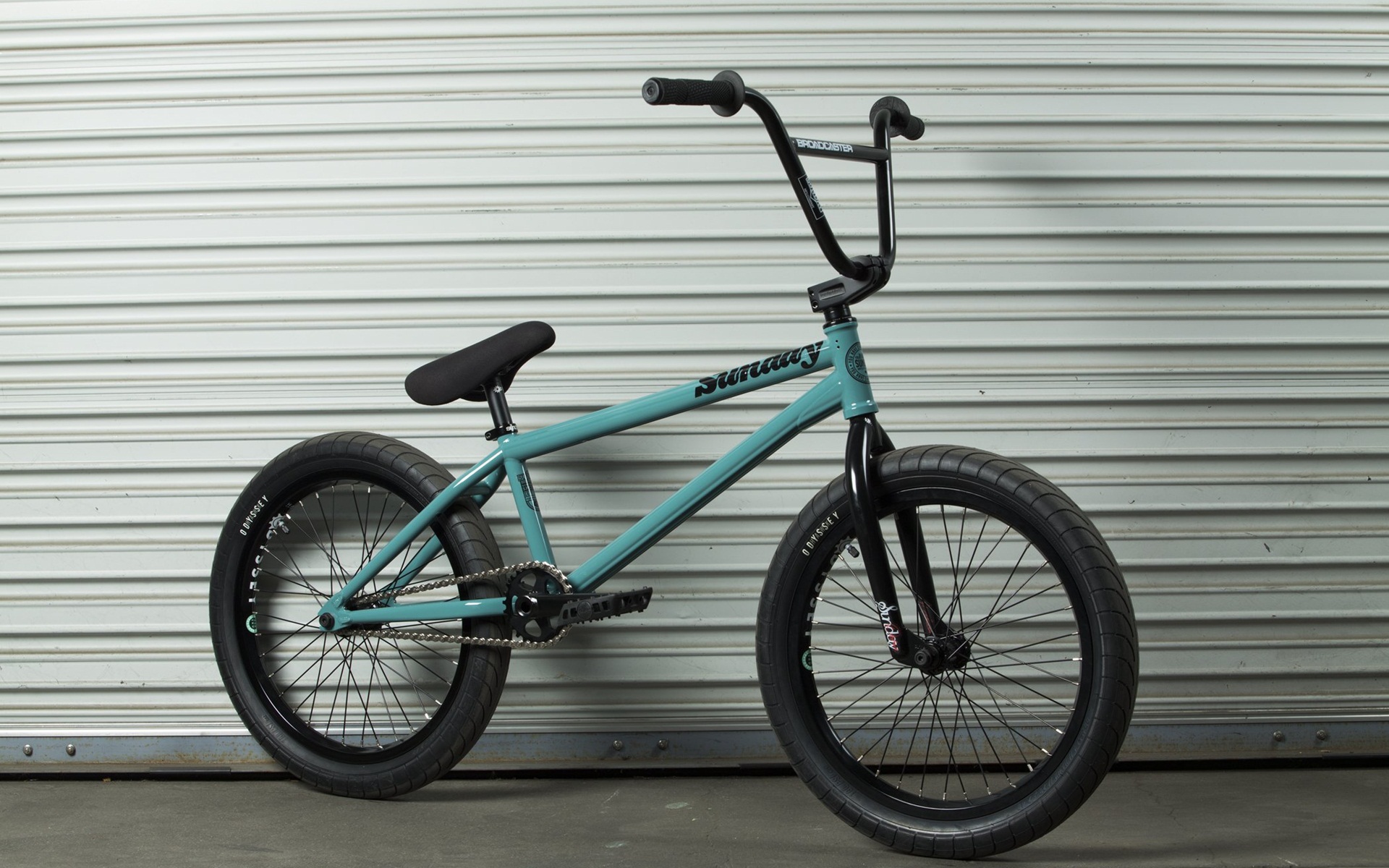 Description: A blue bike is leaning against a wall in front of a garage door and a garage door is closed.