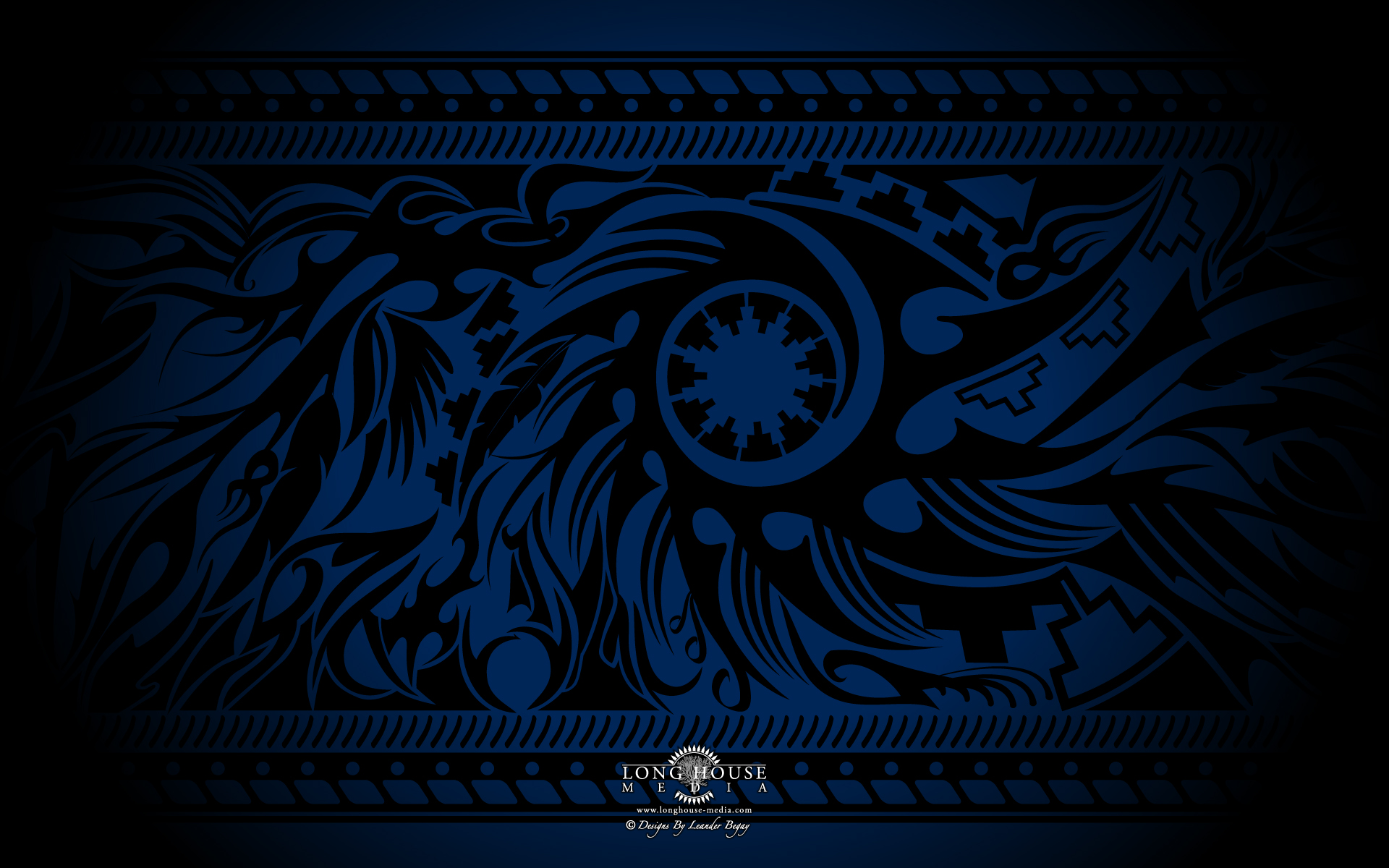 Description: A blue background with a design of a bird and a clock on it's face and a black background.