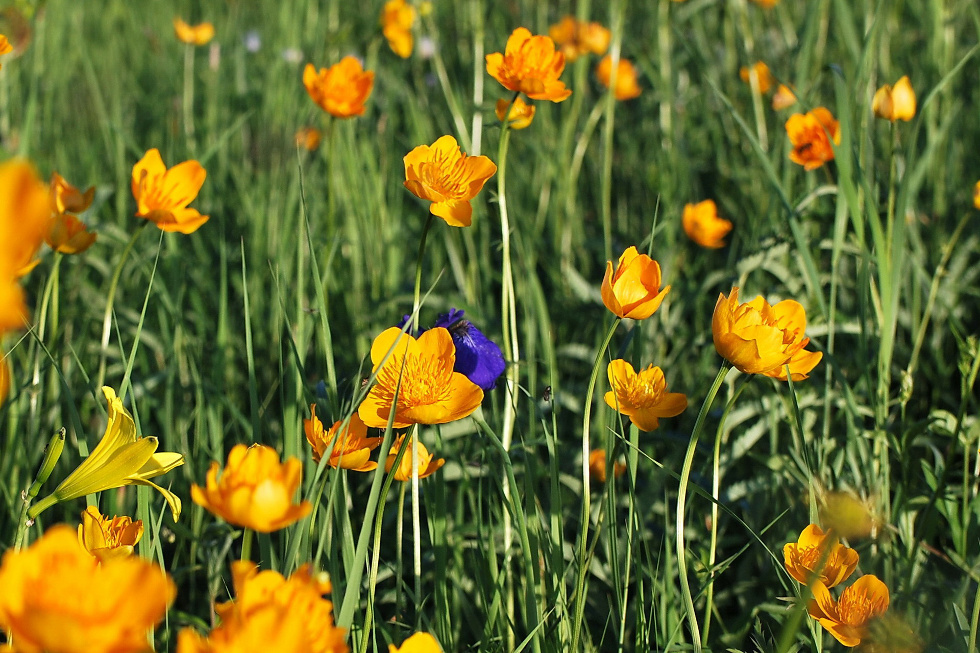 Description: A blue bird sitting on top of a yellow flower field of flowers in the sun.