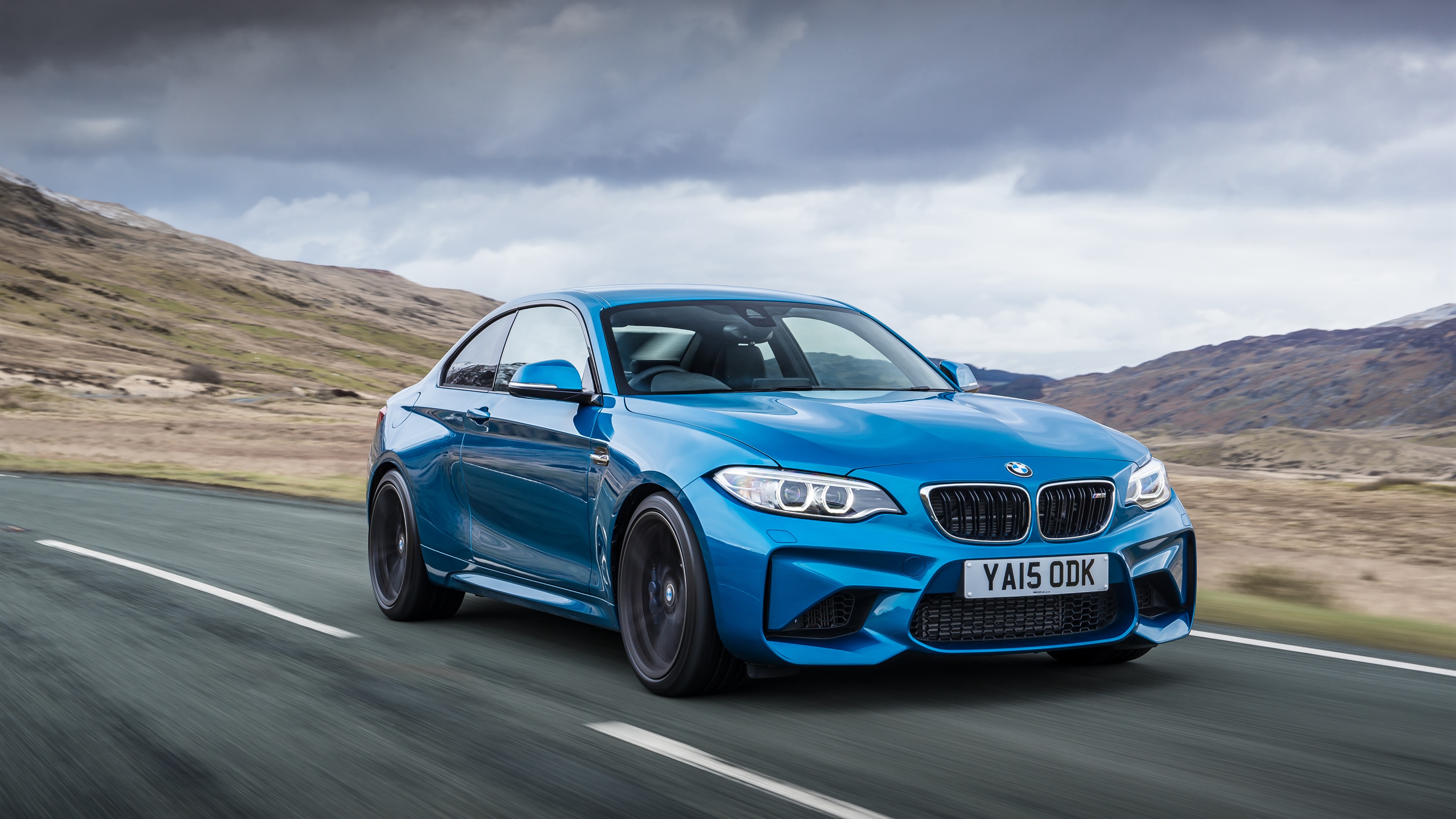 Description: A blue bmw car driving down a road with mountains in the background and clouds in the sky above it.