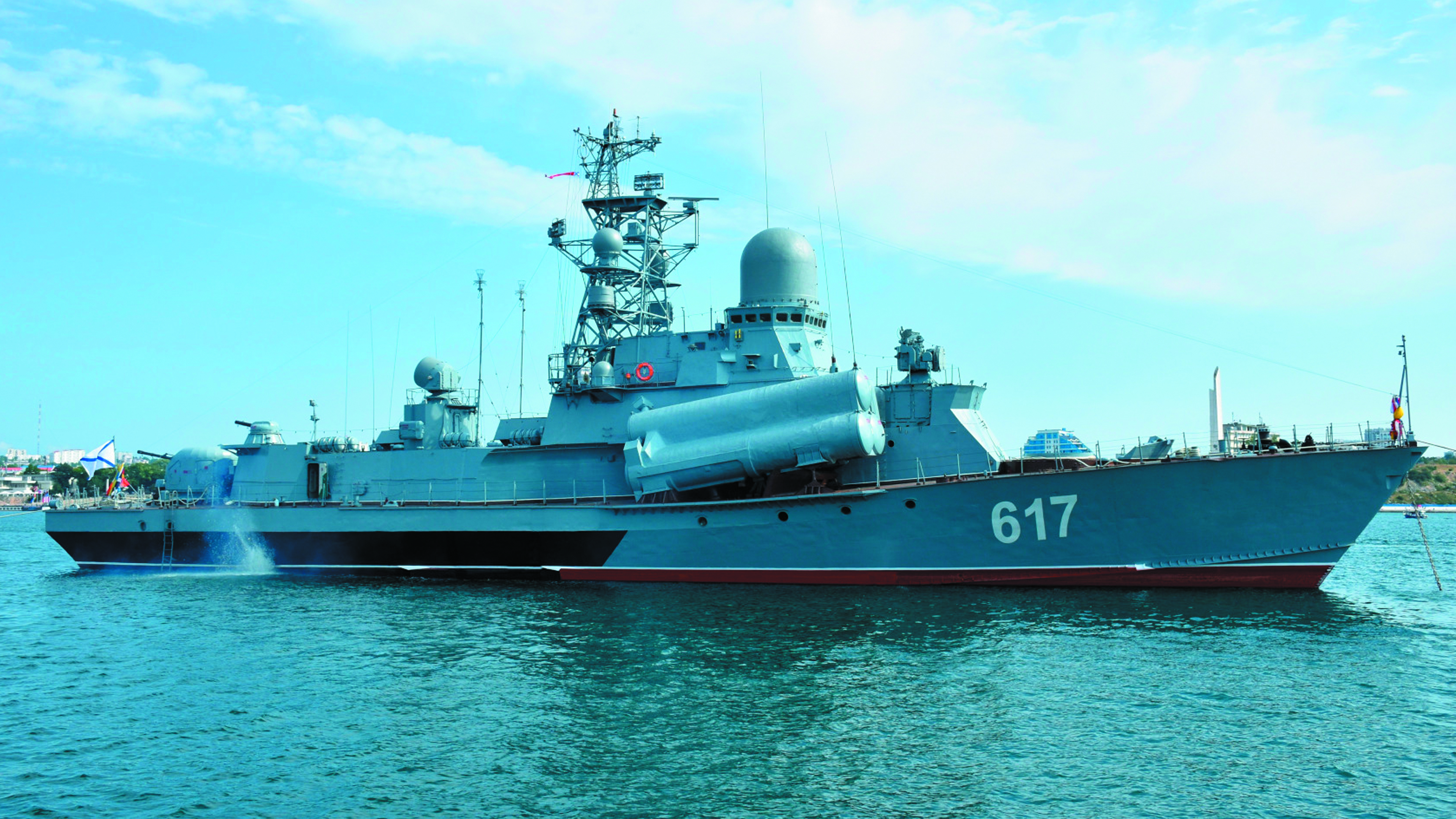 Description: A large blue boat floating on top of a body of water next to a shore line with a city in the background.