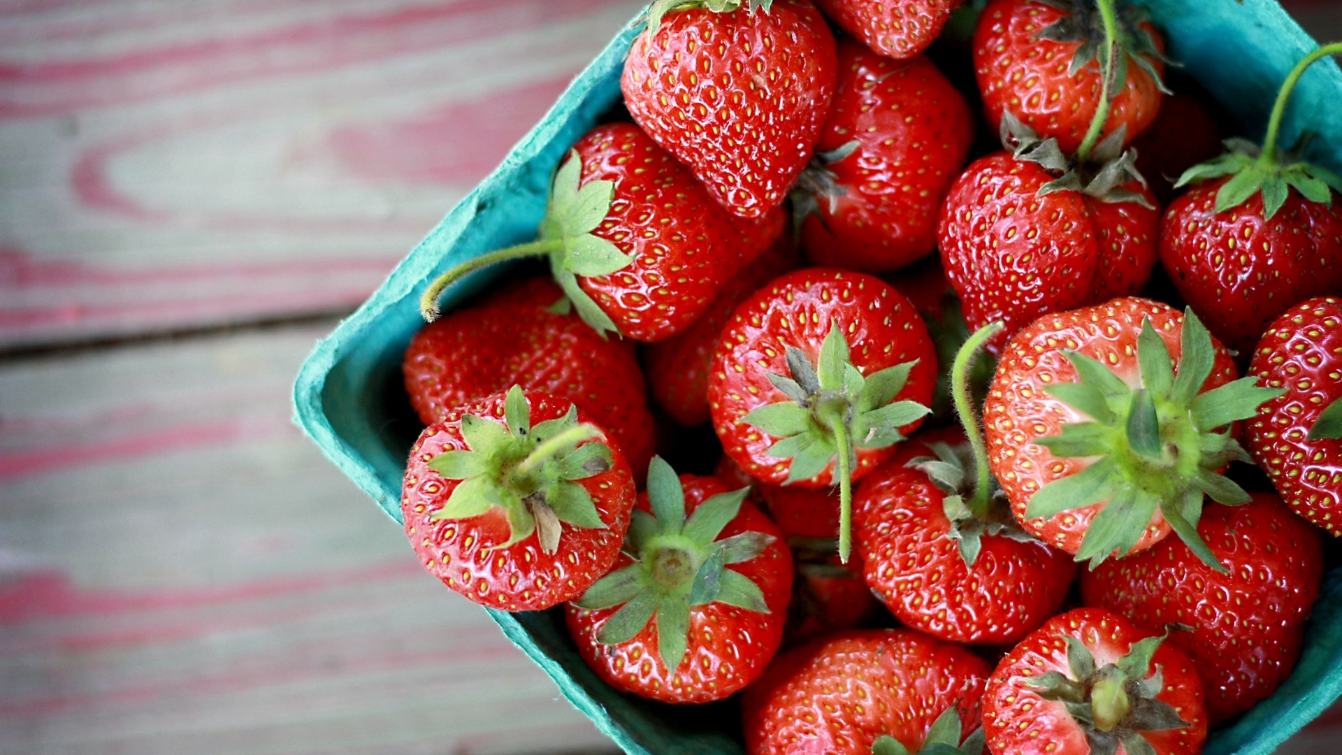 Description: A blue bowl filled with lots of ripe strawberries on top of a wooden table next to a wooden fence.
