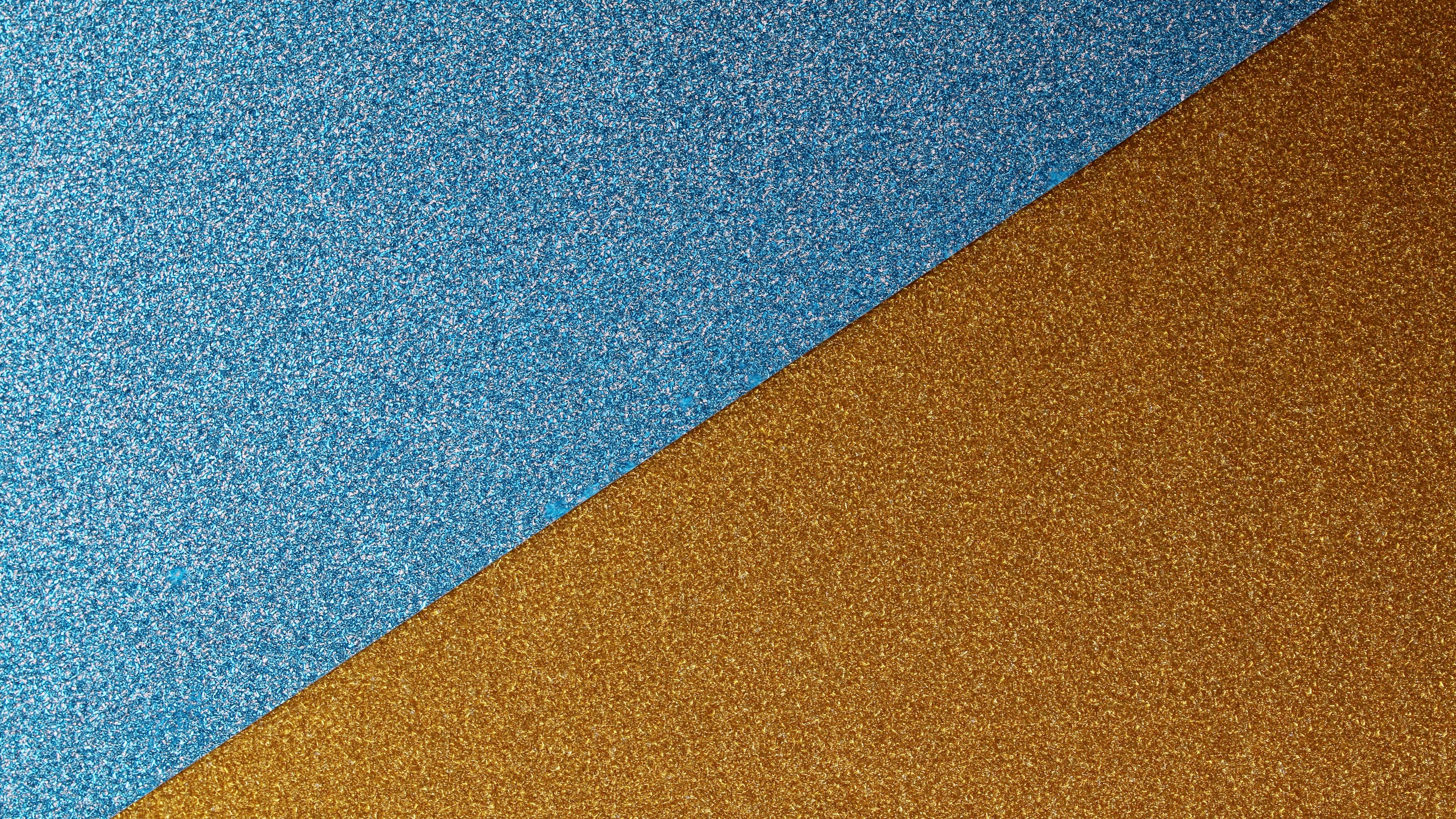 Description: A blue and brown wall with a white clock on it's side and a yellow and blue wall.