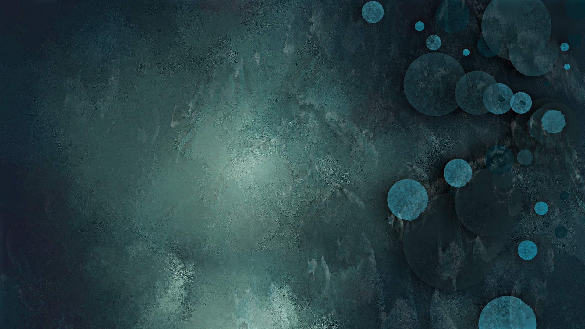 Description: A painting of blue bubbles on a dark background with a white spot in the middle of the picture and a black spot in the middle of the picture.