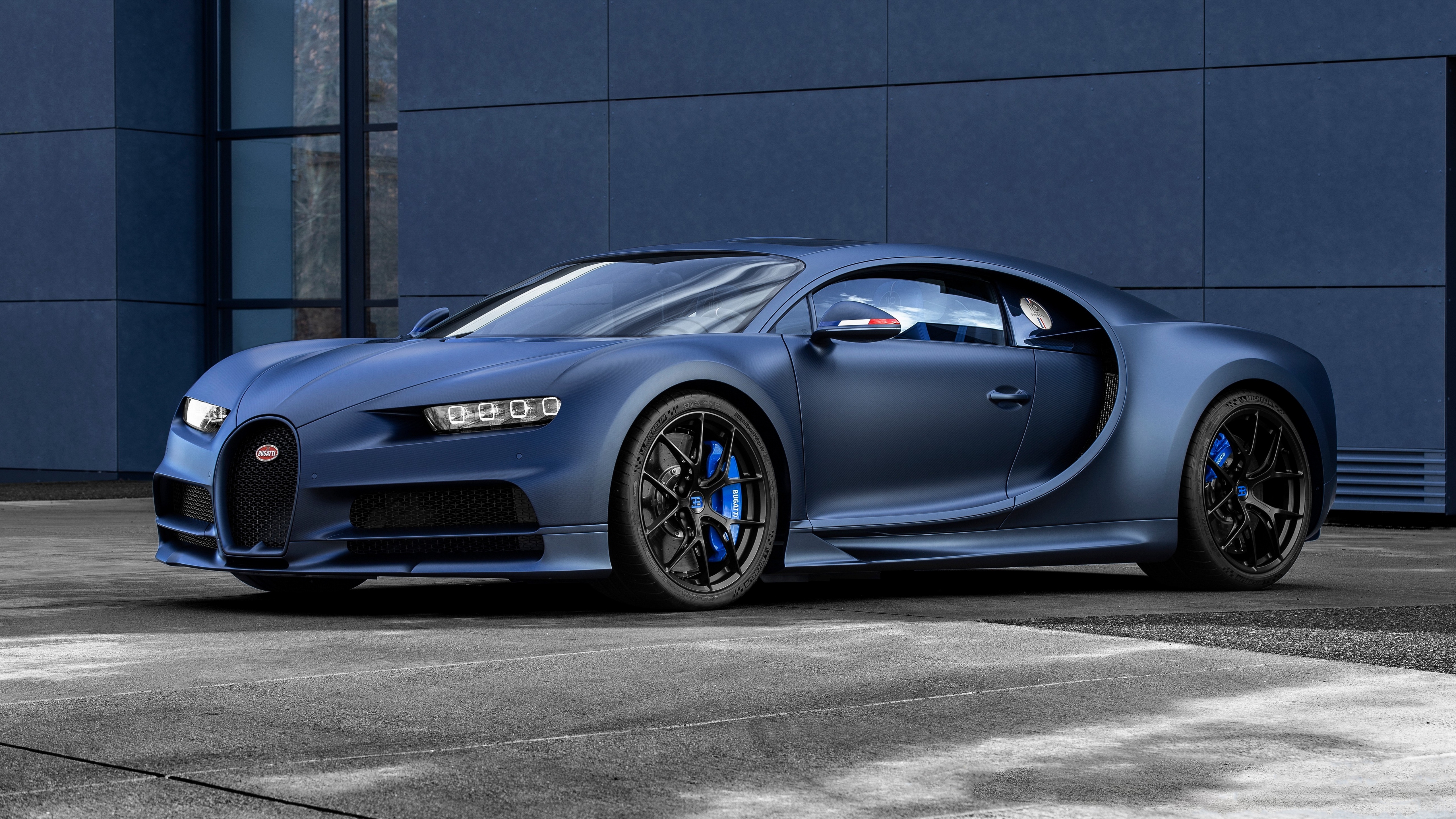 Description: A blue bugatti car parked in front of a building with a blue wall behind it and a black and white photo of the bugatti.