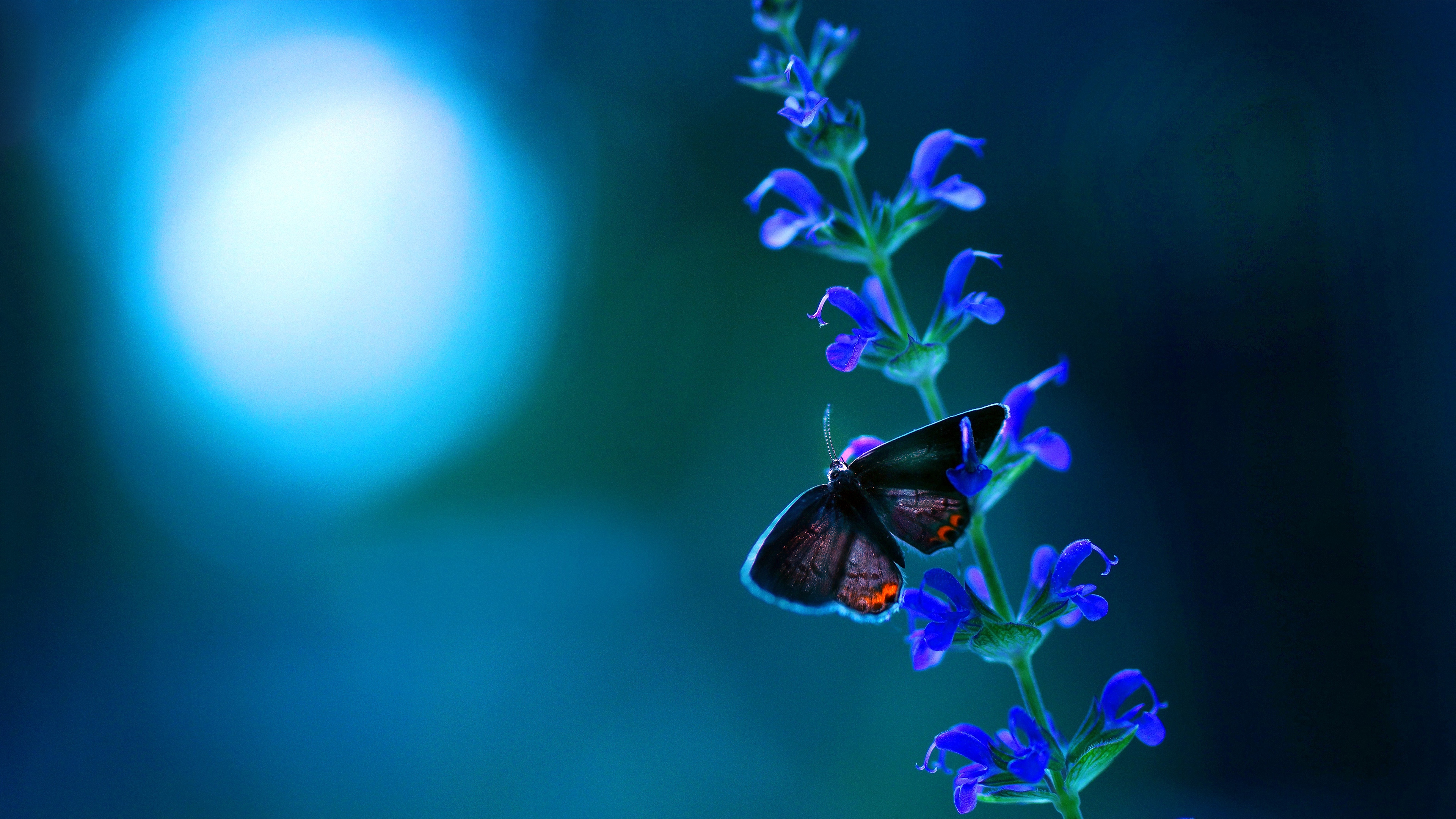 Description: A butterfly sitting on a flower with a blue background behind it and a blue light in the background behind it.
