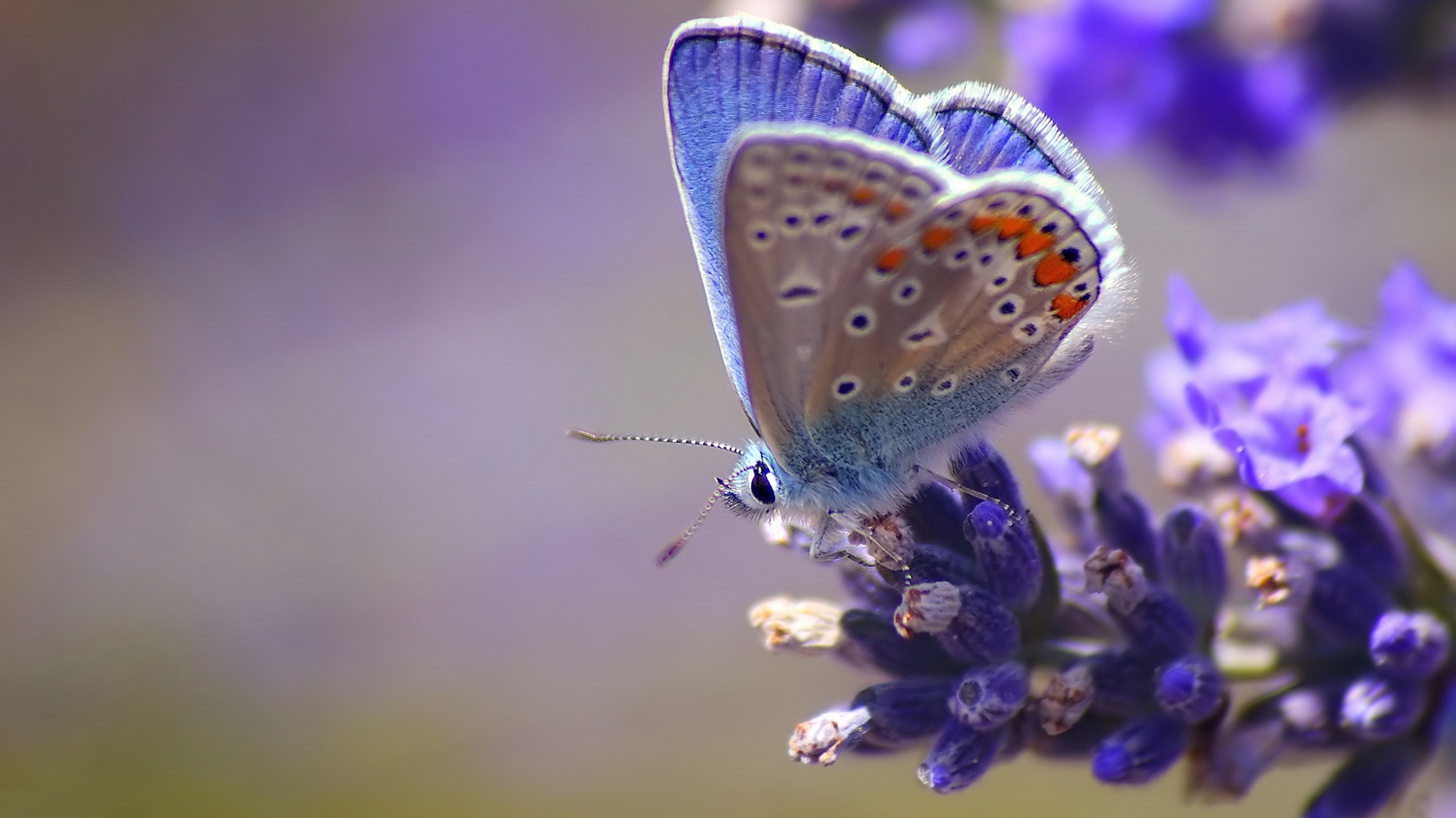Description: A blue butterfly sitting on a purple flower with a blurry background of purple flowers and a green stem.