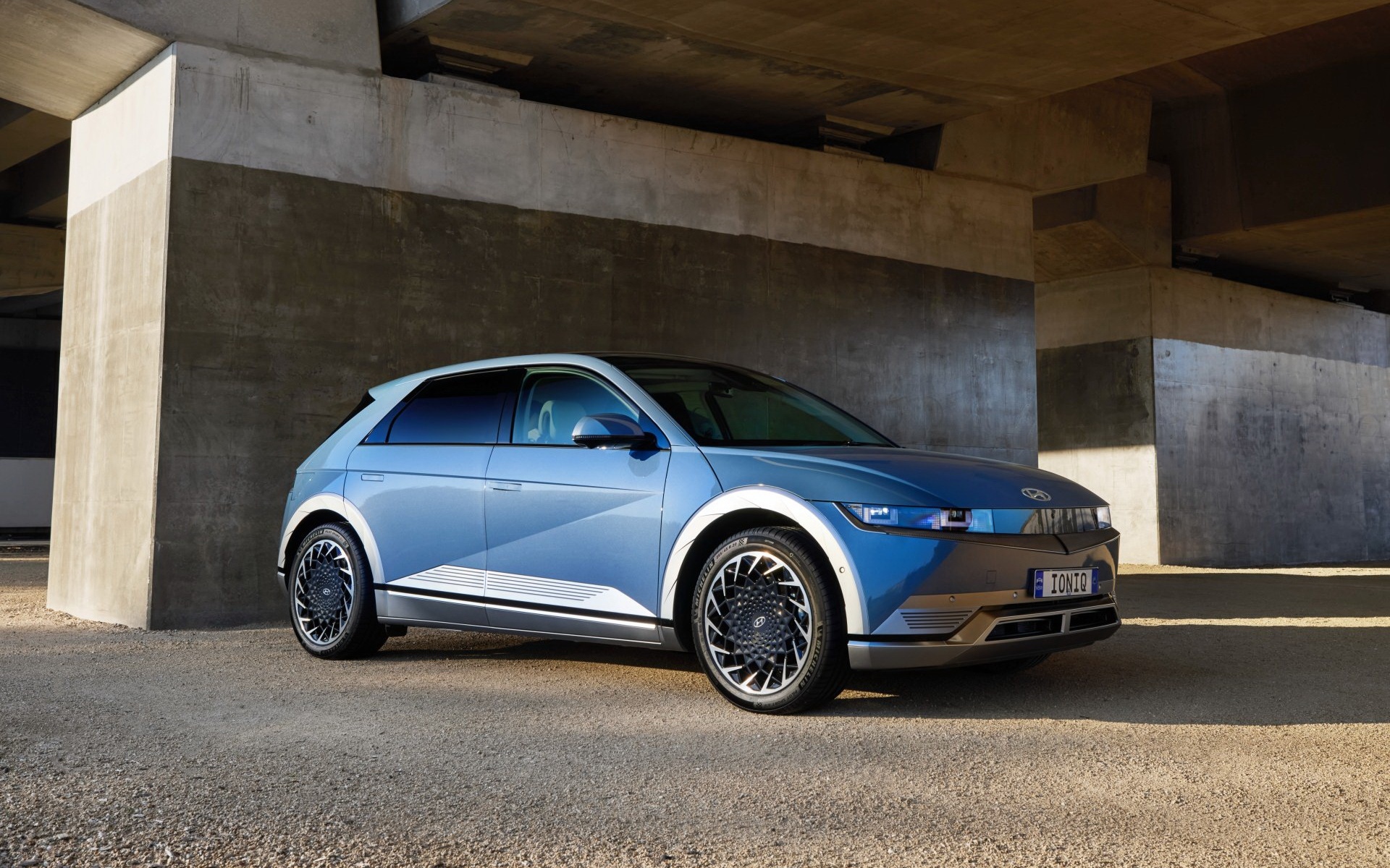 Description: A blue car parked in front of a building under a bridge with concrete walls and a concrete floor below.