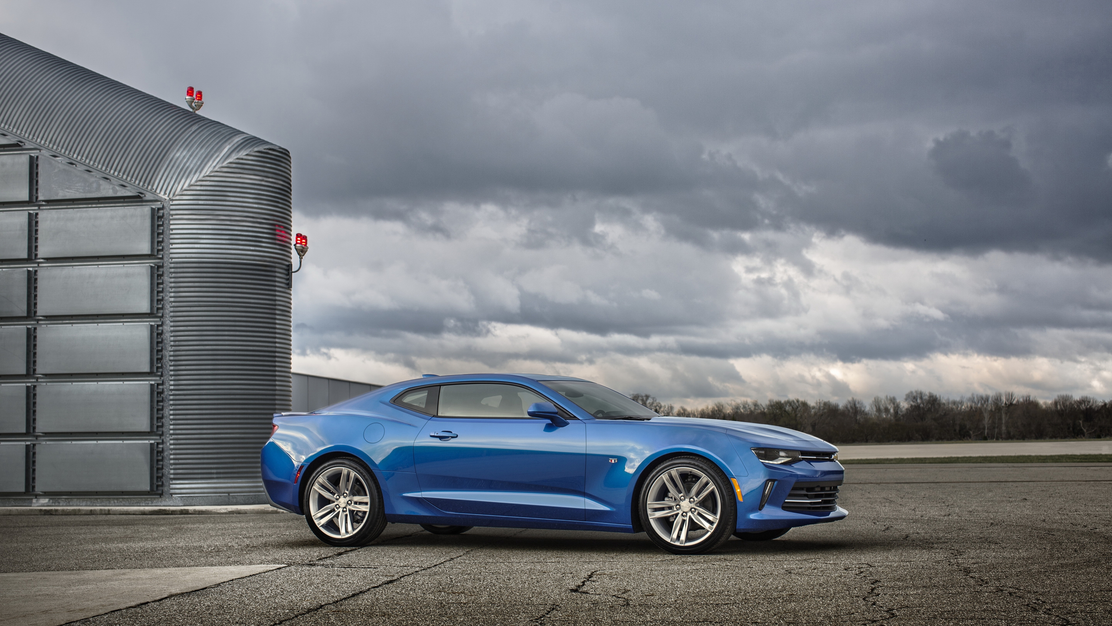 Description: A blue car parked in front of a building under a cloudy sky with a red light on it's side.