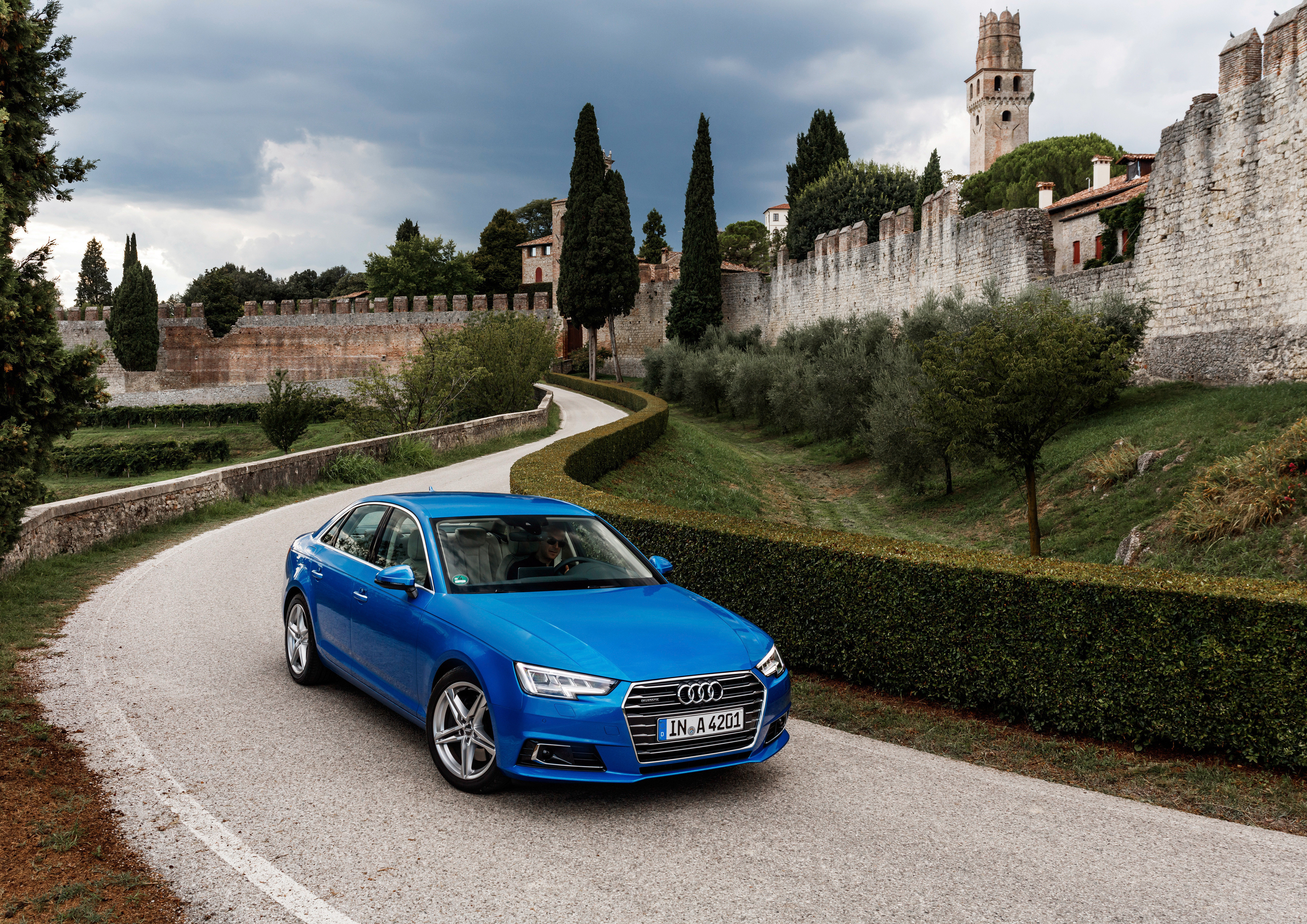 Description: A blue car driving down a road next to a castle and trees on a cloudy day with a dark sky.