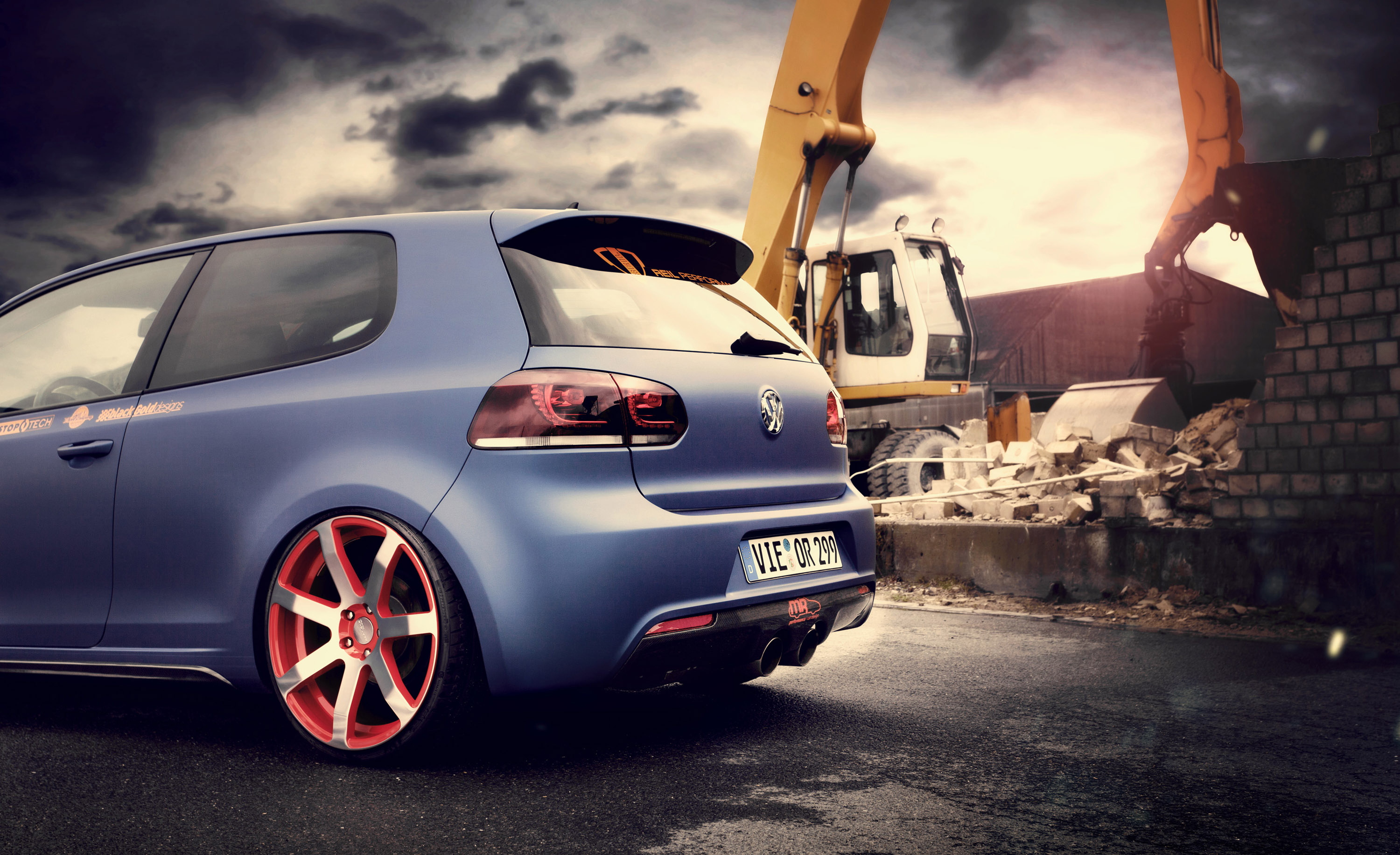 Description: A blue car parked in front of a construction vehicle on a street with a bulldozer in the background.