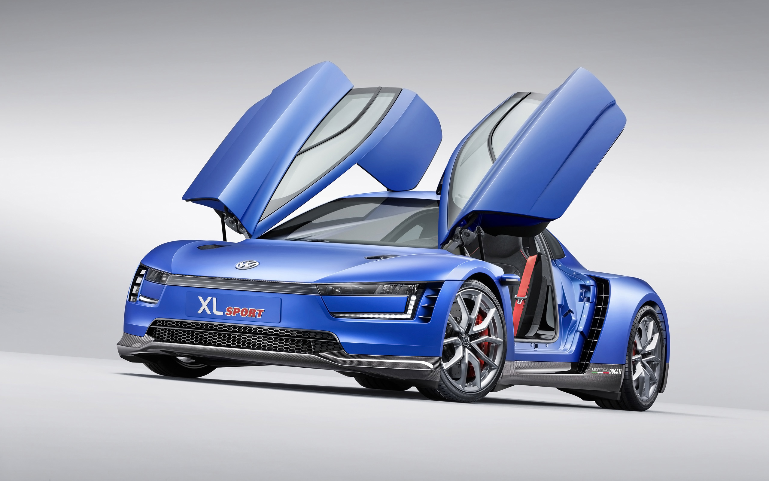 Description: A blue car with its doors open and the hood open on it's side.