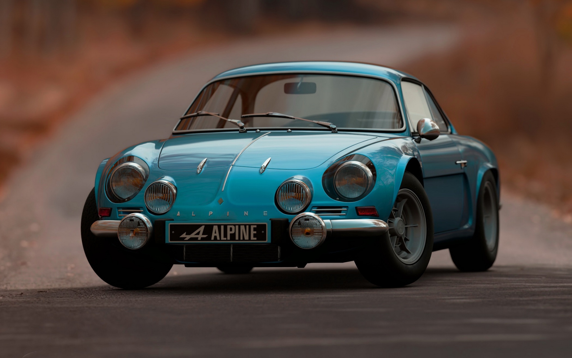 Description: A blue car driving down a road next to a forest filled with trees and bushes on a sunny day.