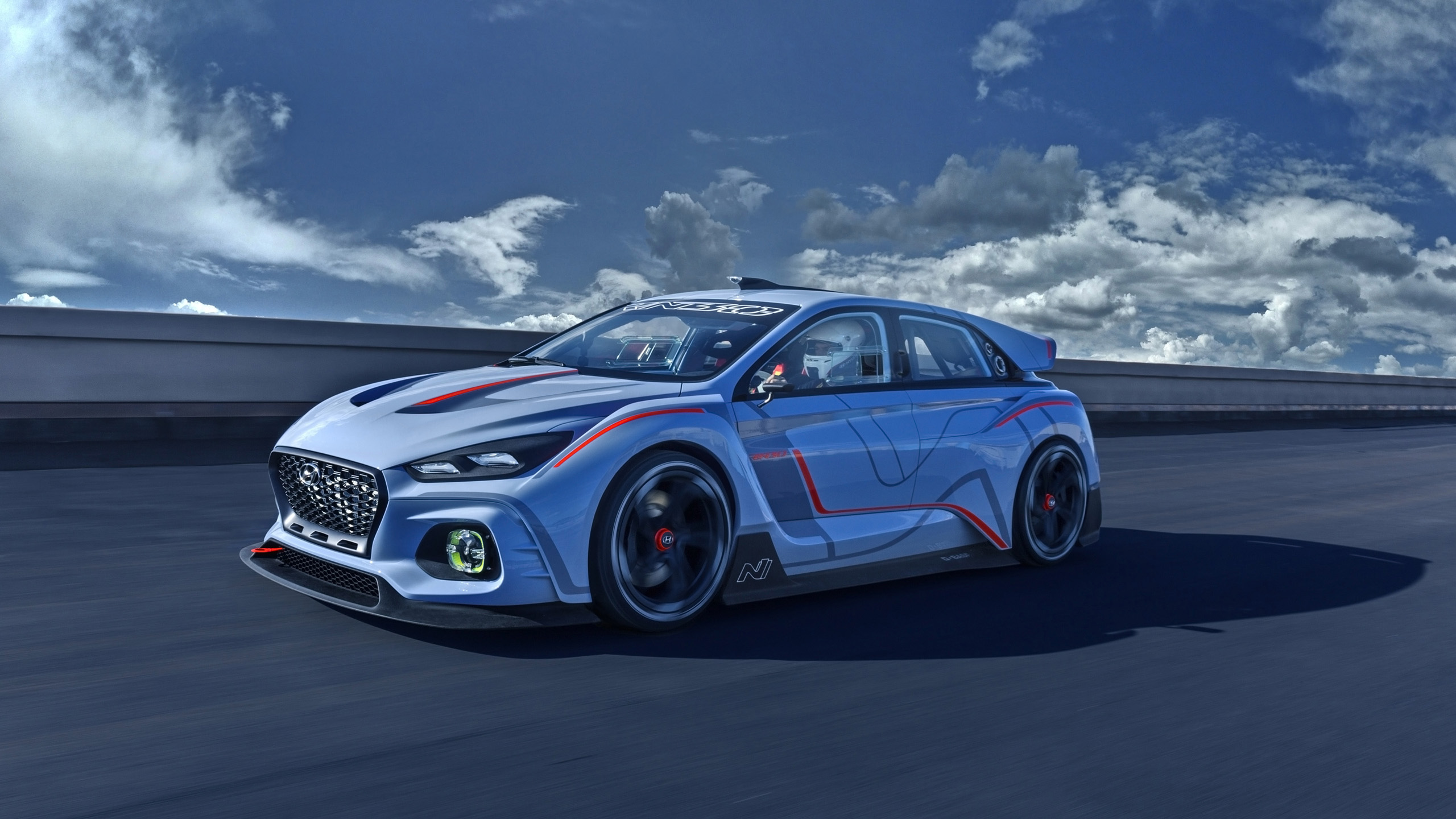 Description: A blue car driving down a road under a cloudy sky with clouds in the background and a blue sky with white clouds.