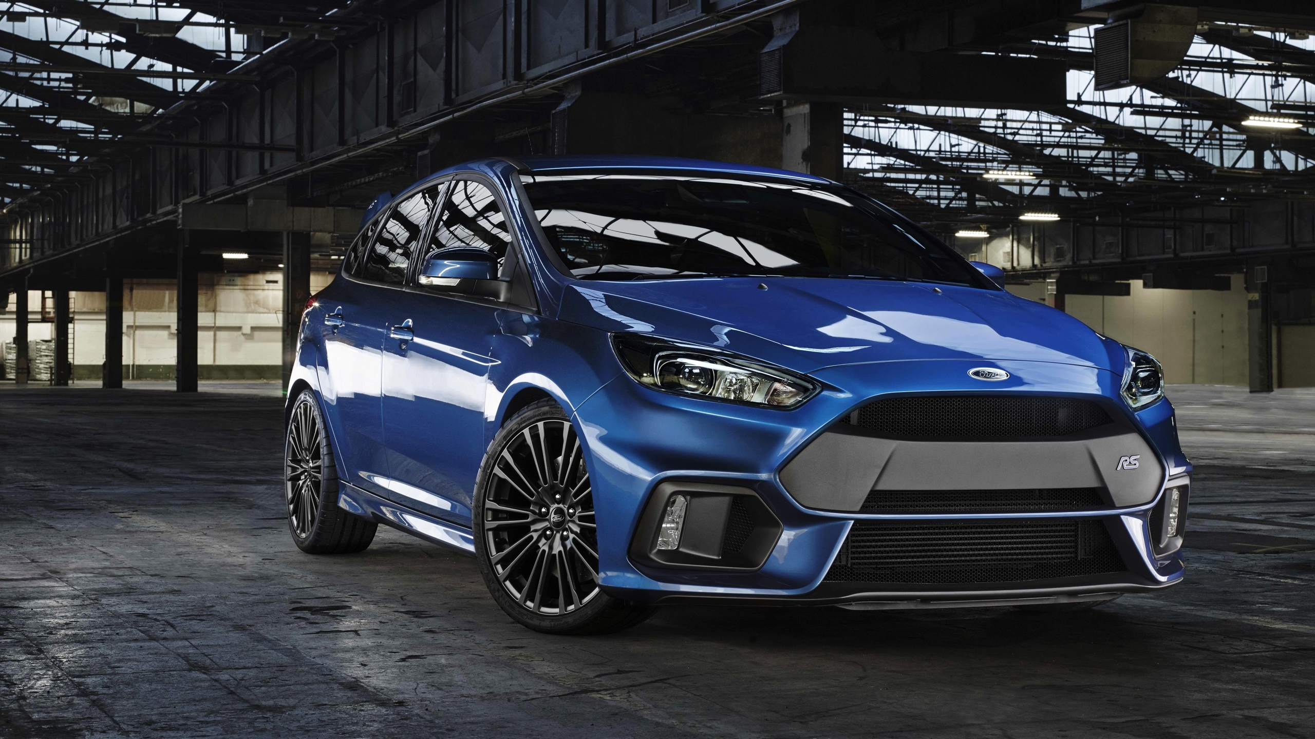 Description: A blue car parked in a garage with a roof rack and a roof rack on the roof of the car.
