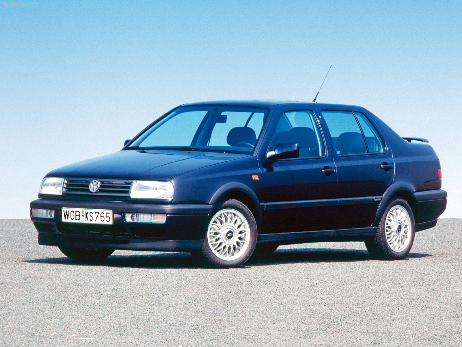 Description: A blue car parked on a gravel road next to a blue sky and a white cloudless sky in the background.