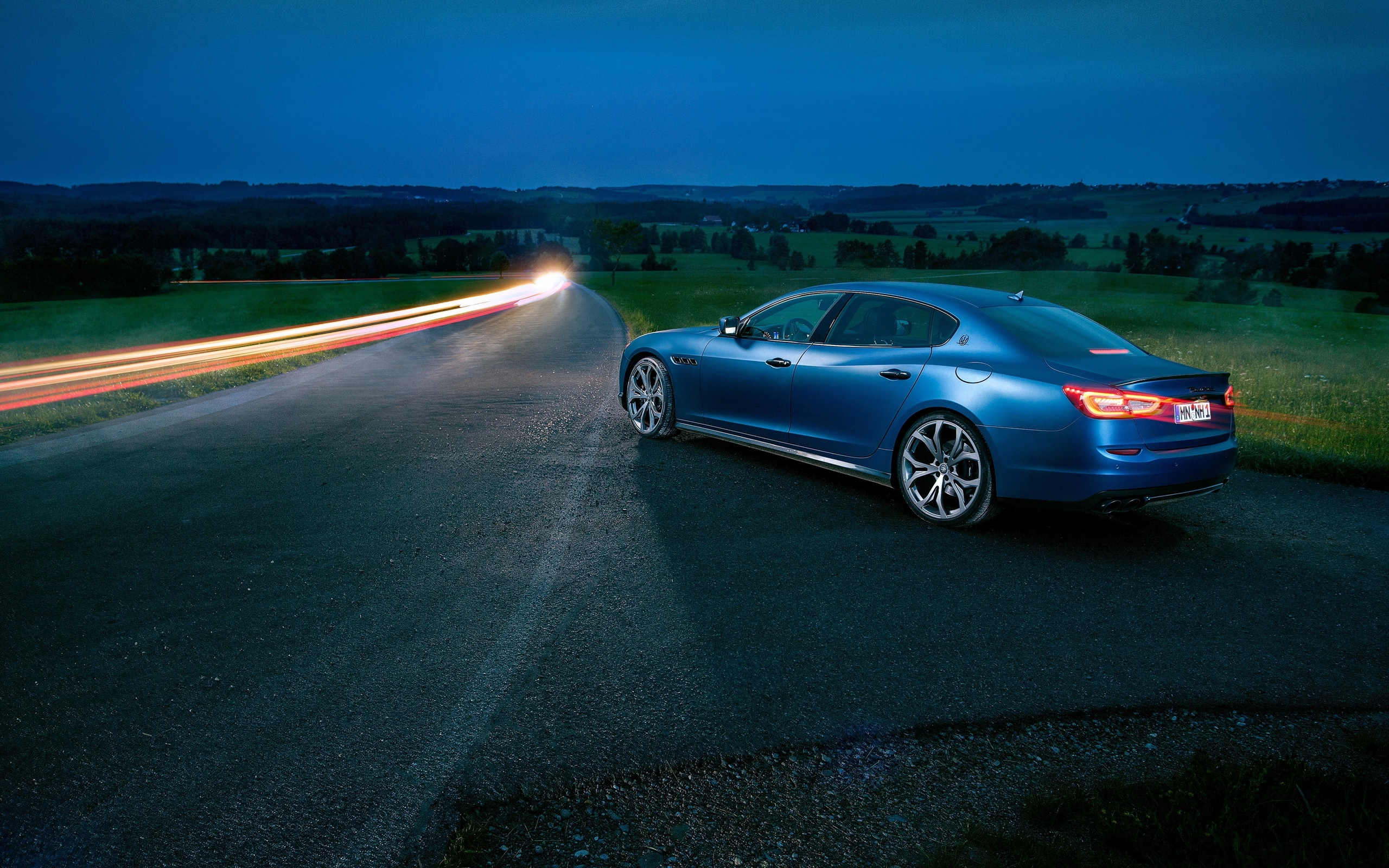 Description: A blue car driving down a road at night with a car light streaking by behind it and a car on the road.