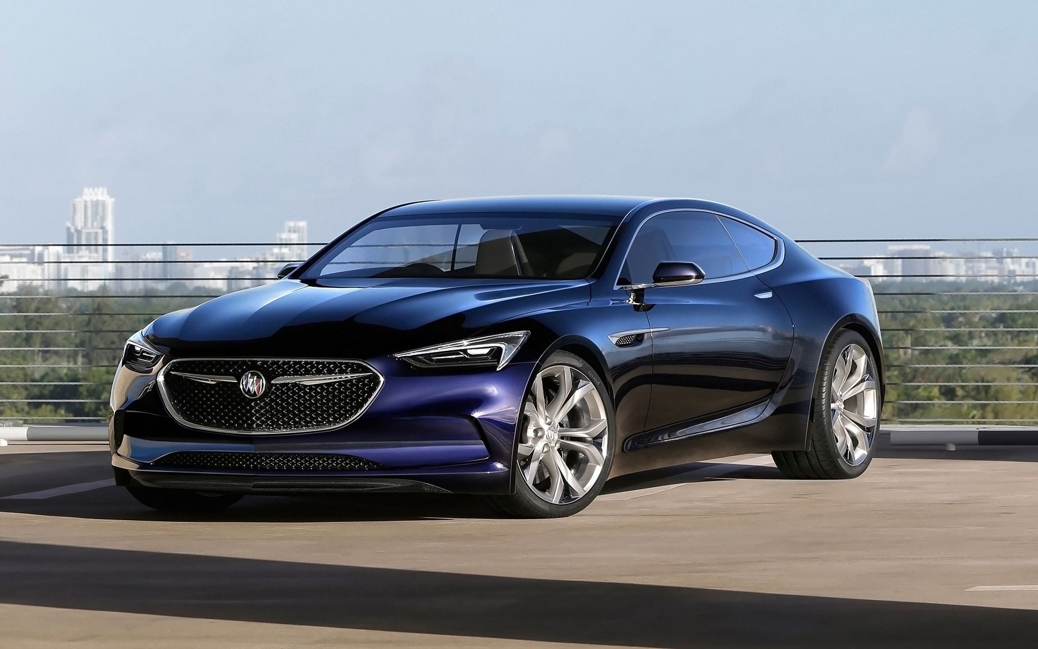 Description: A blue car is parked on a bridge near a city skyline and a bridge with a few buildings in the background.