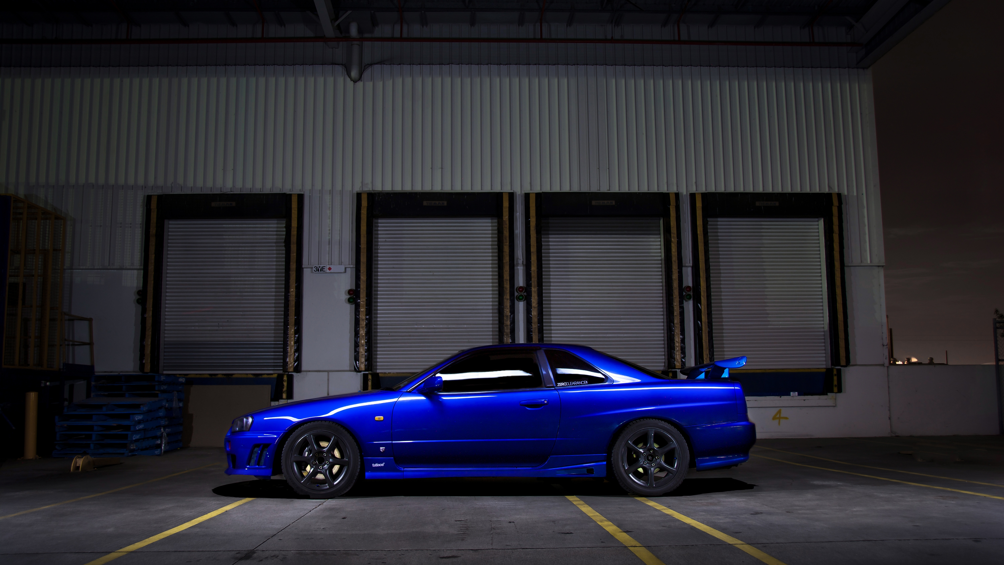 Description: A blue car parked in a parking lot next to a building with closed windows and shutters on the side.