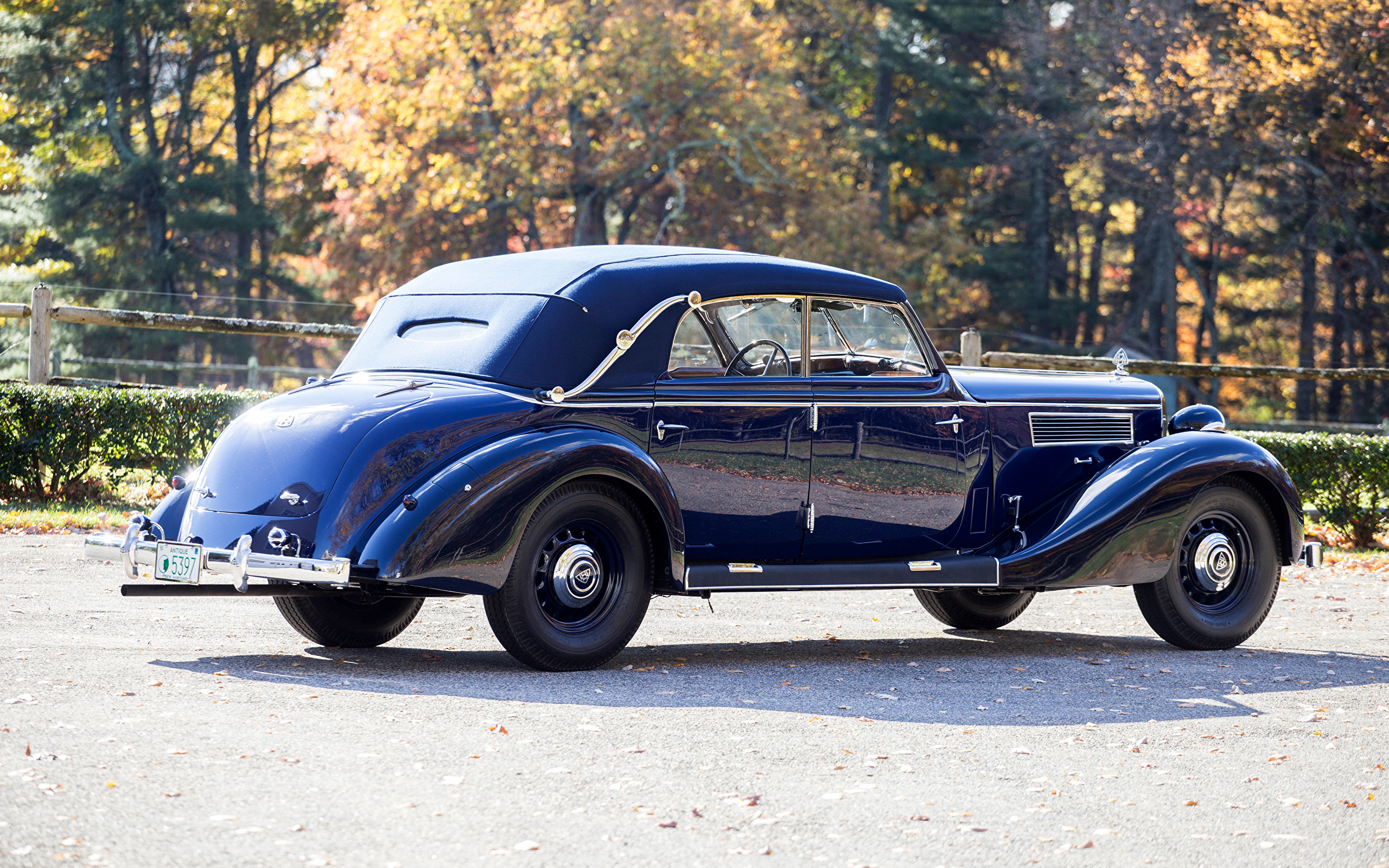 Description: A blue car parked in a parking lot next to a forest of trees and bushes with a fence in the background.