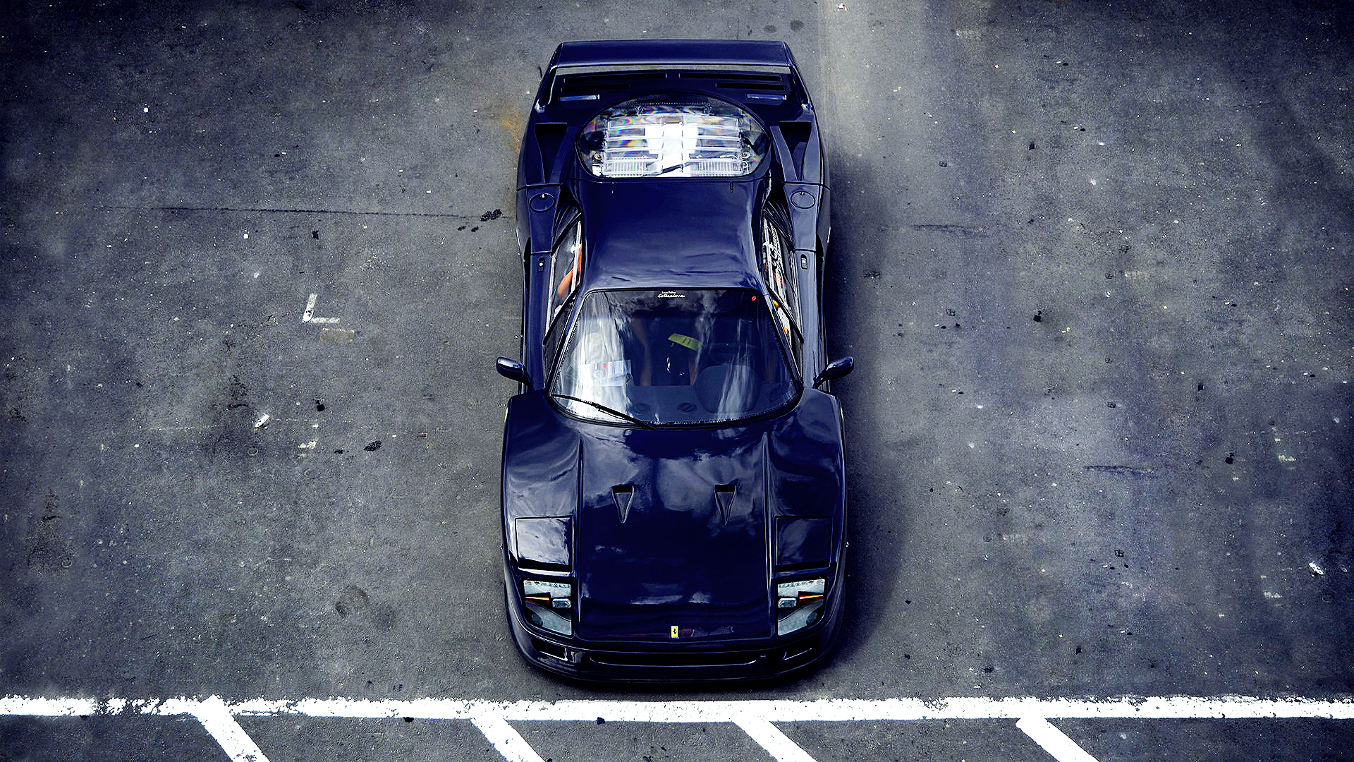Description: A blue sports car parked in a parking lot with a parking meter on the side of it's roof.