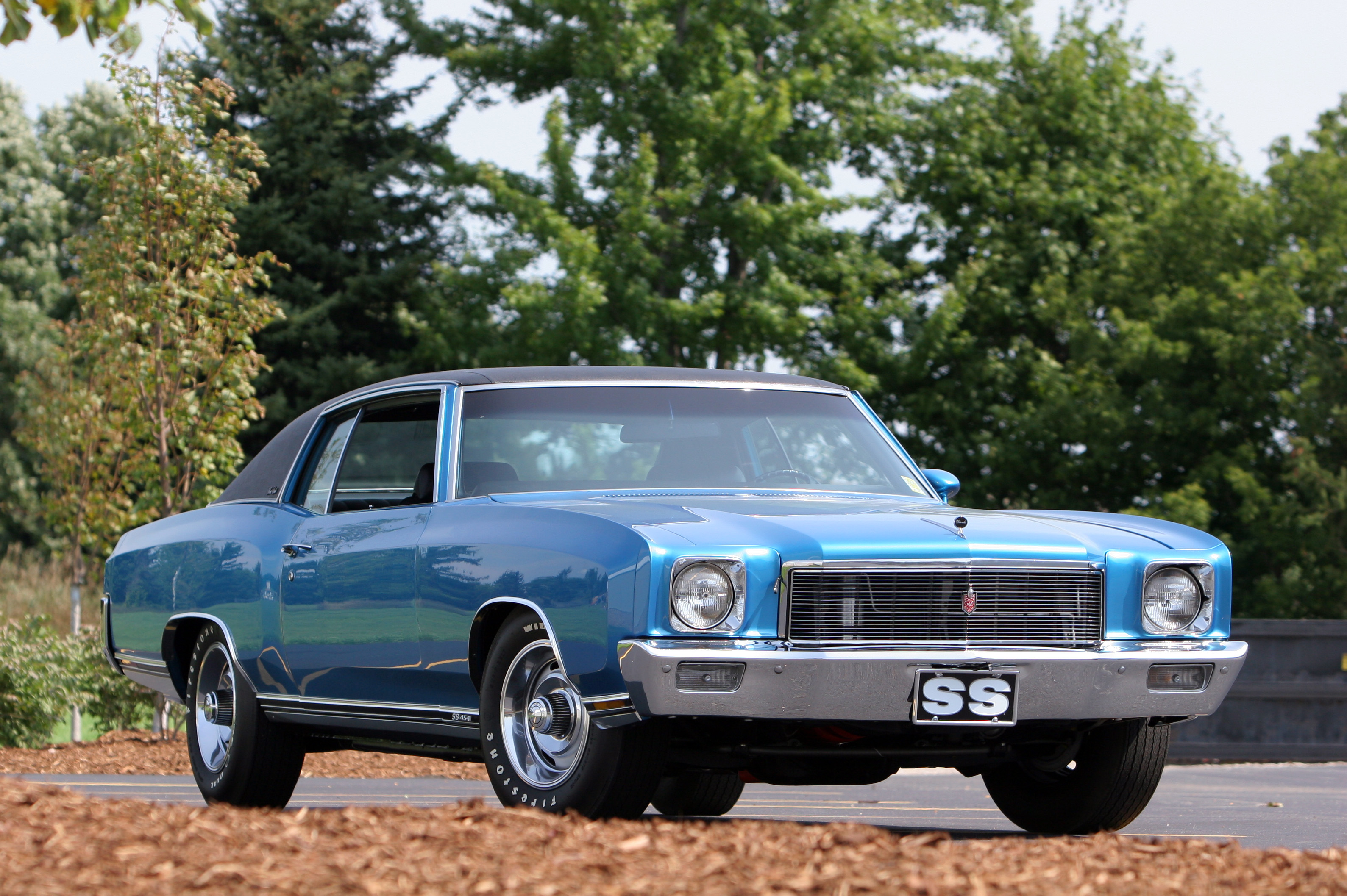 Description: A blue car parked on a road next to trees and bushes in a parking lot with a sign that says sss.