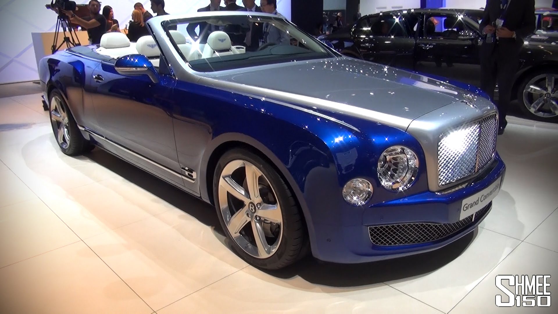 Description: A blue car is on display at a showroom with people looking at it and a woman standing next to it.