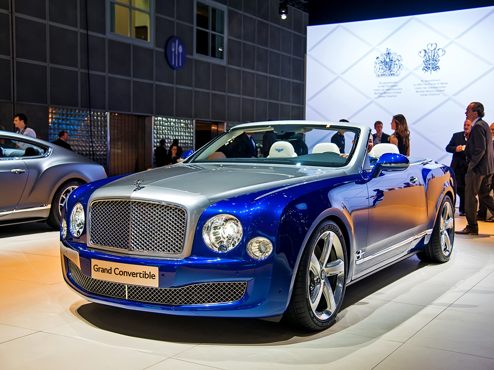 Description: A blue car is on display at a showroom with people looking at it and a woman standing next to it.