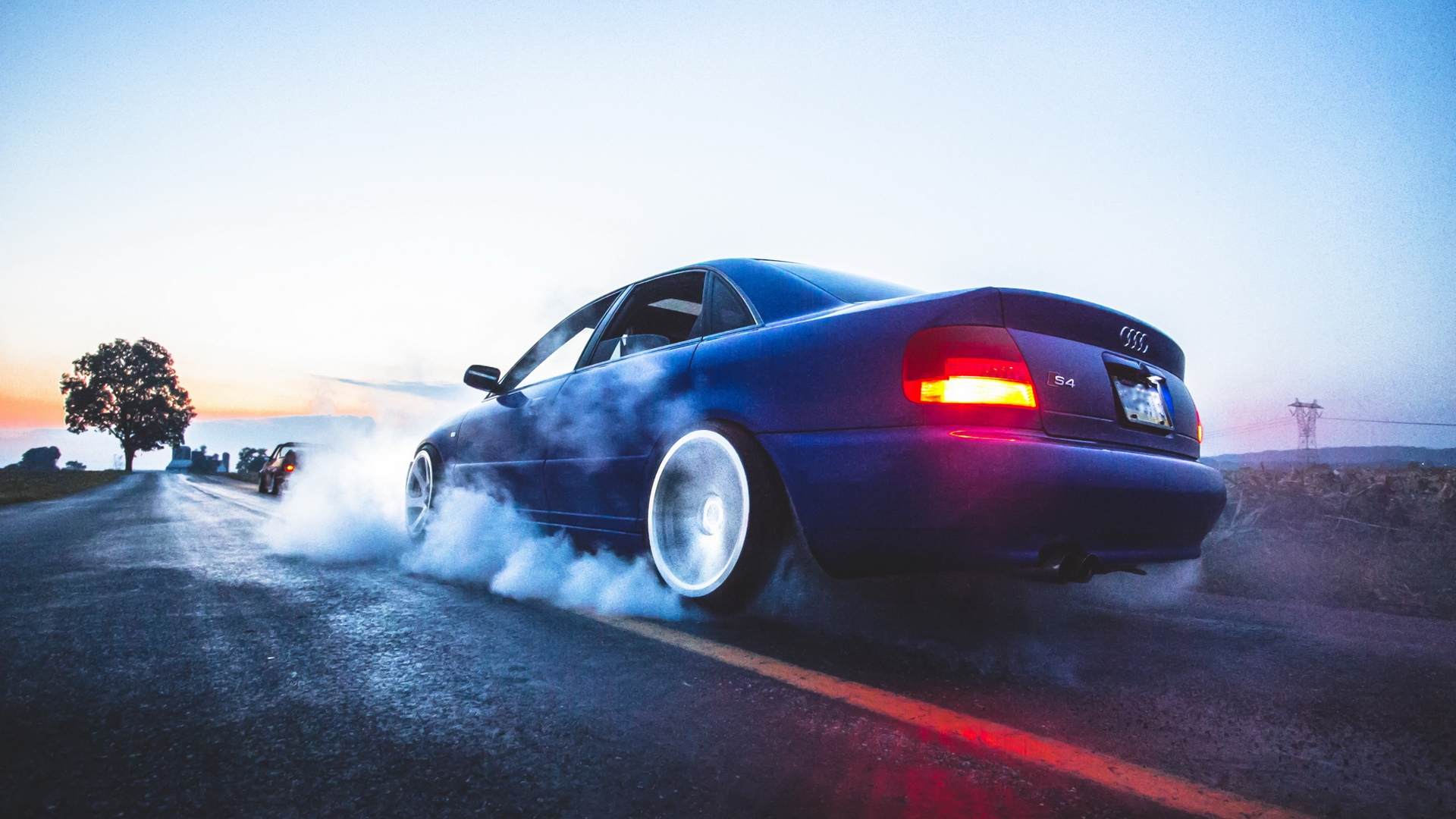 Description: A blue car with smoke coming out of it's exhaust system on a road with people standing around.