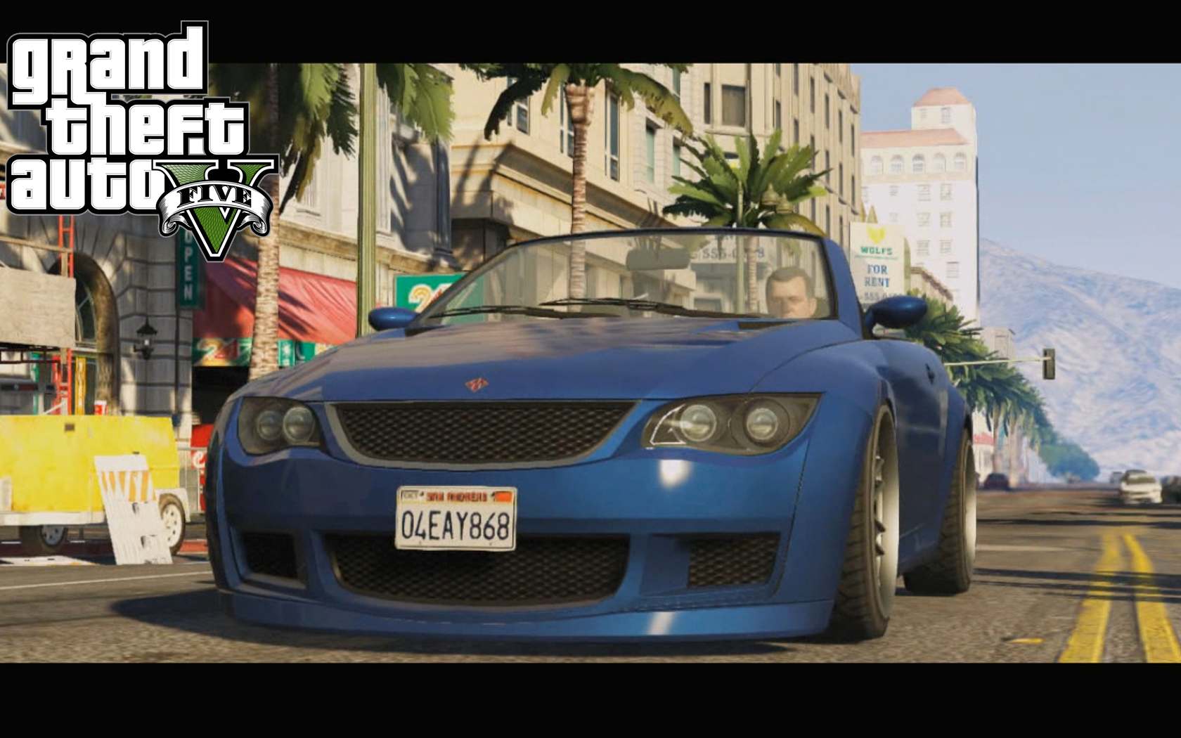 Description: A blue car driving down a street next to tall buildings and palm trees in gta 5's.