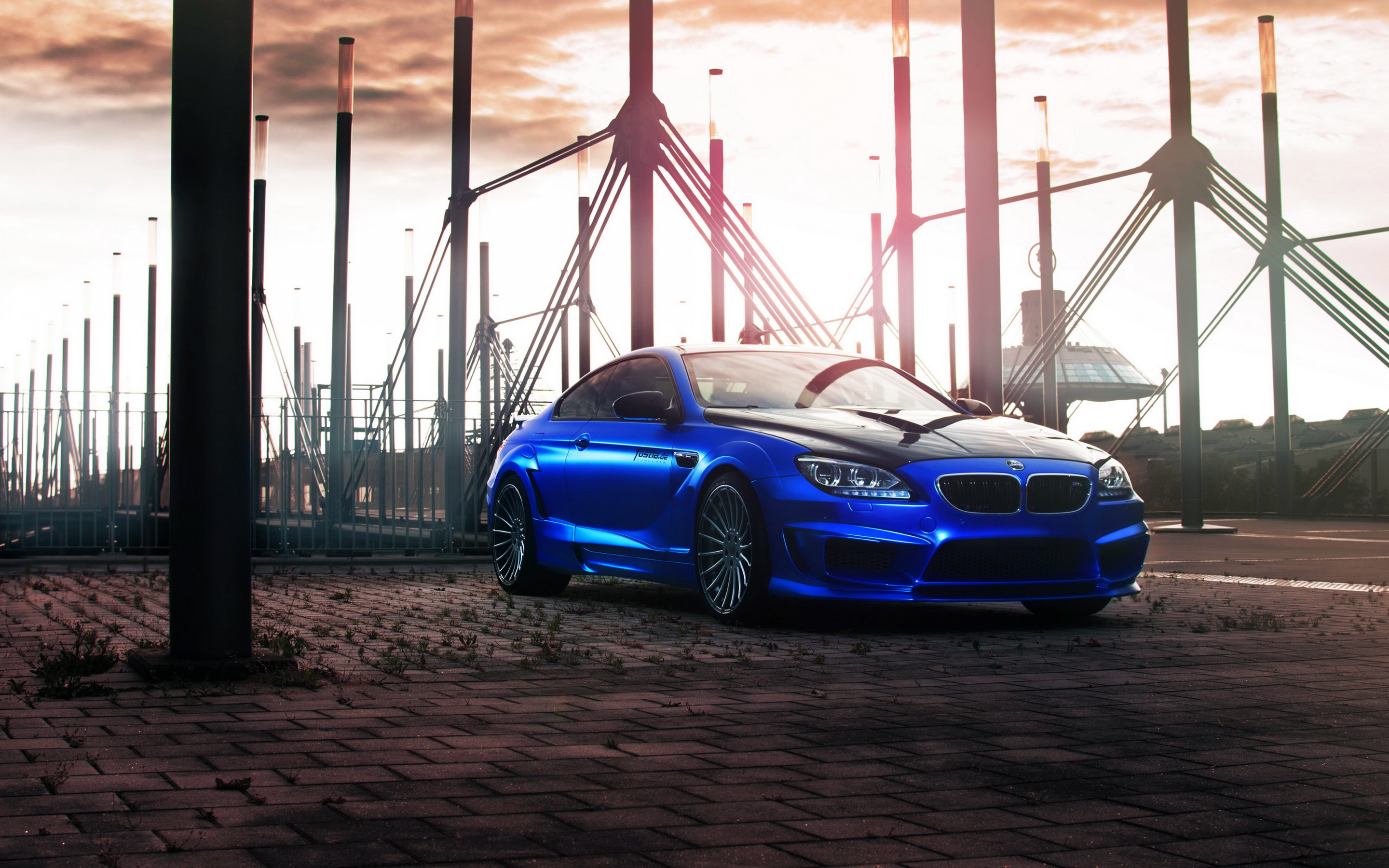 Description: A blue car parked in front of a large structure with a sky background and clouds in the background.