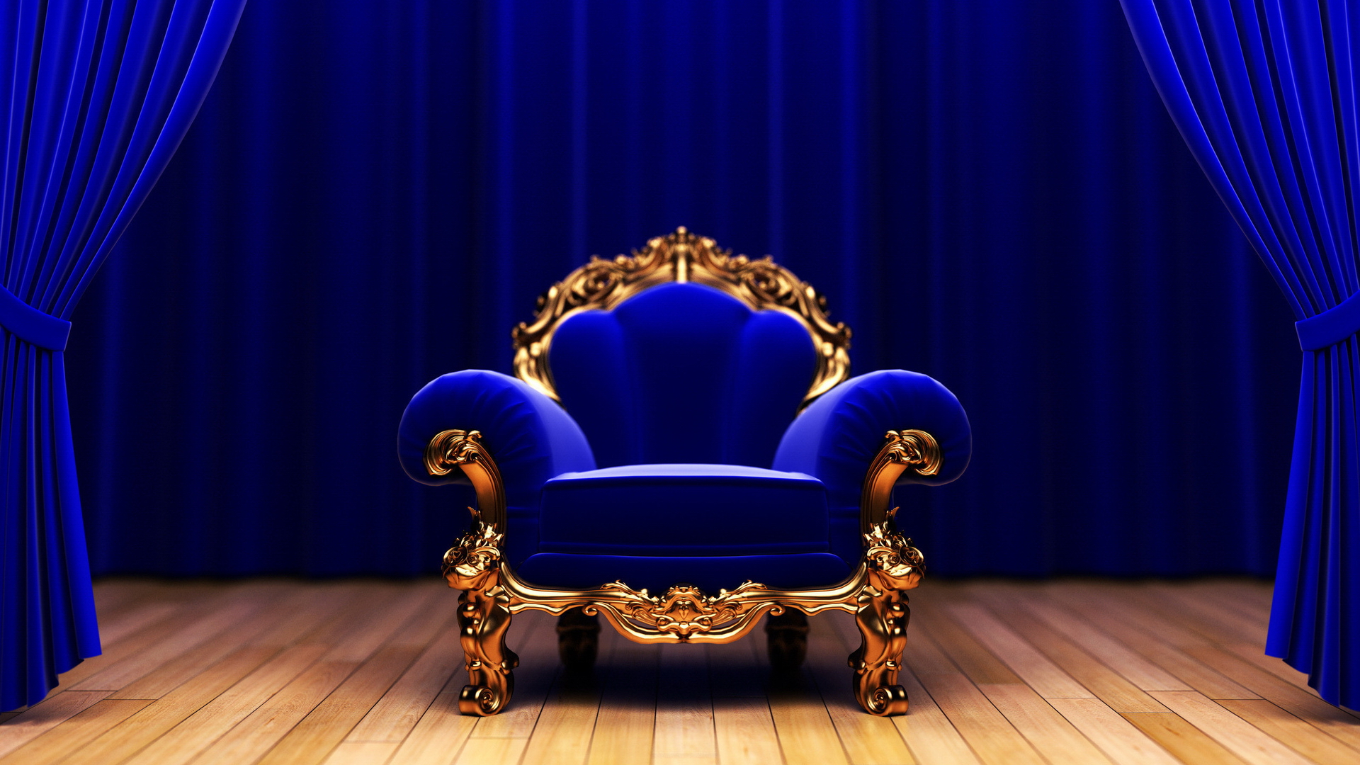 Description: A blue chair sitting in front of a blue curtain with a gold frame on it's back and a wooden floor.