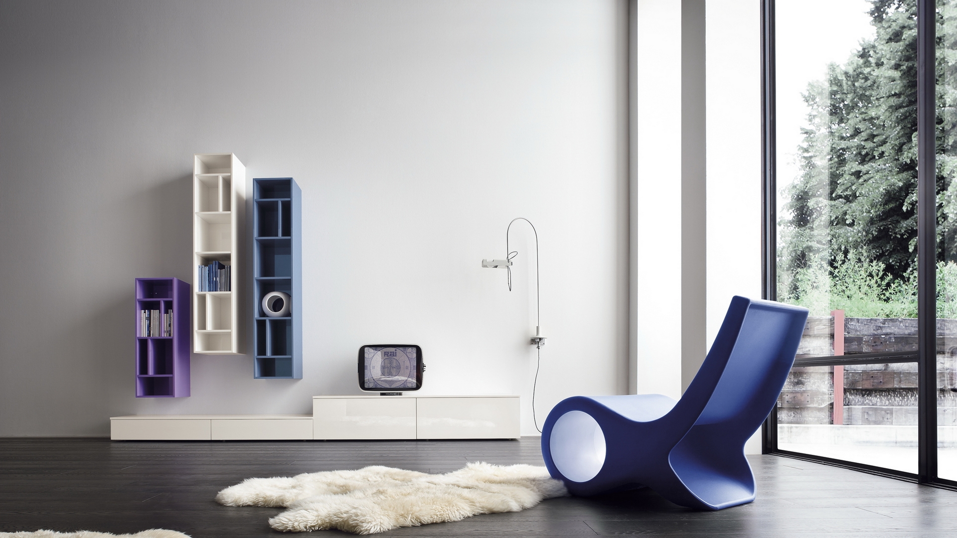 Description: A living room with a blue chair and a white rug on the floor and a book shelf with a television on it.