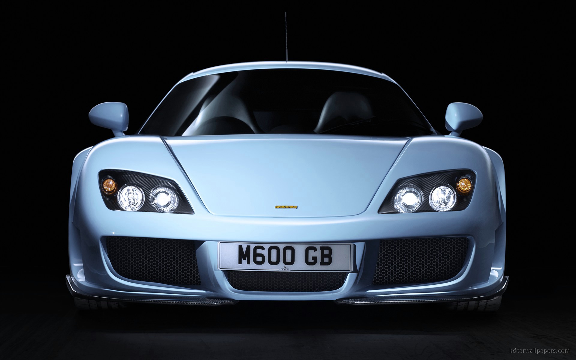 Description: A blue sports car is shown in the dark room with its lights on and the hood down and the front lights on.