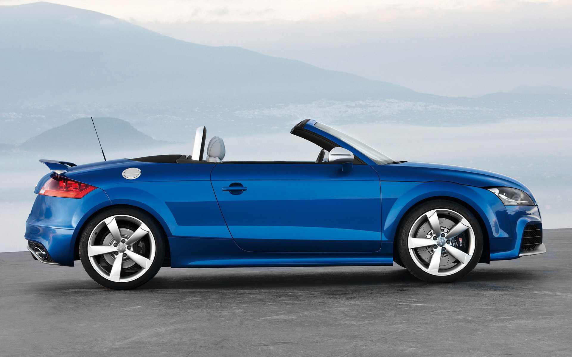 Description: A blue convertible car parked in a parking lot with mountains in the background and a cloudy sky above it.