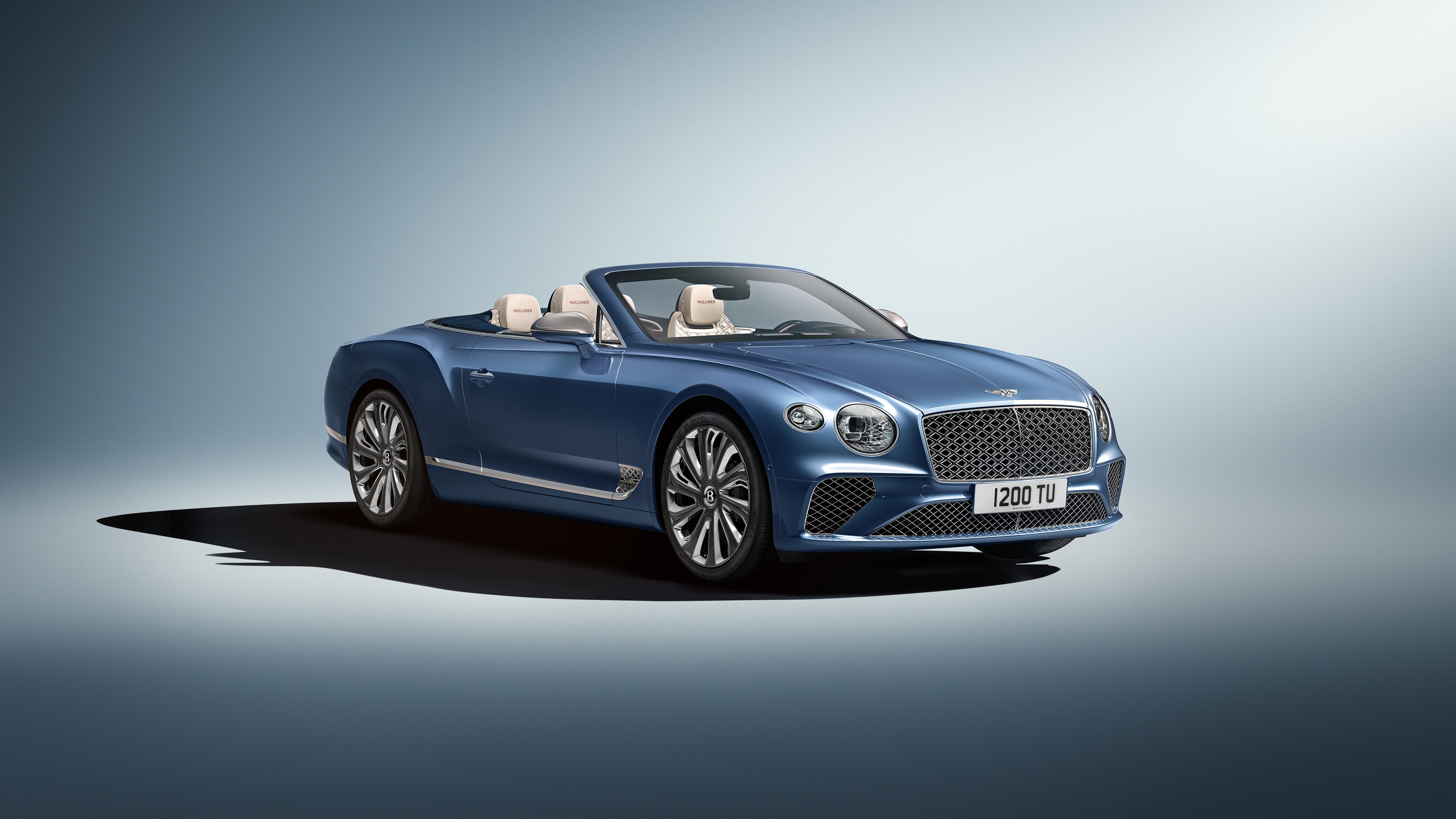 Description: A blue convertible car with a white top and a black interior is shown in a studio setting with a gray background.