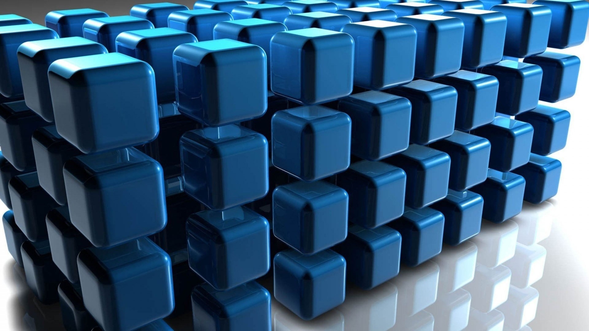 Description: A group of blue cubes sitting on top of a white table top next to each other on a reflective surface.