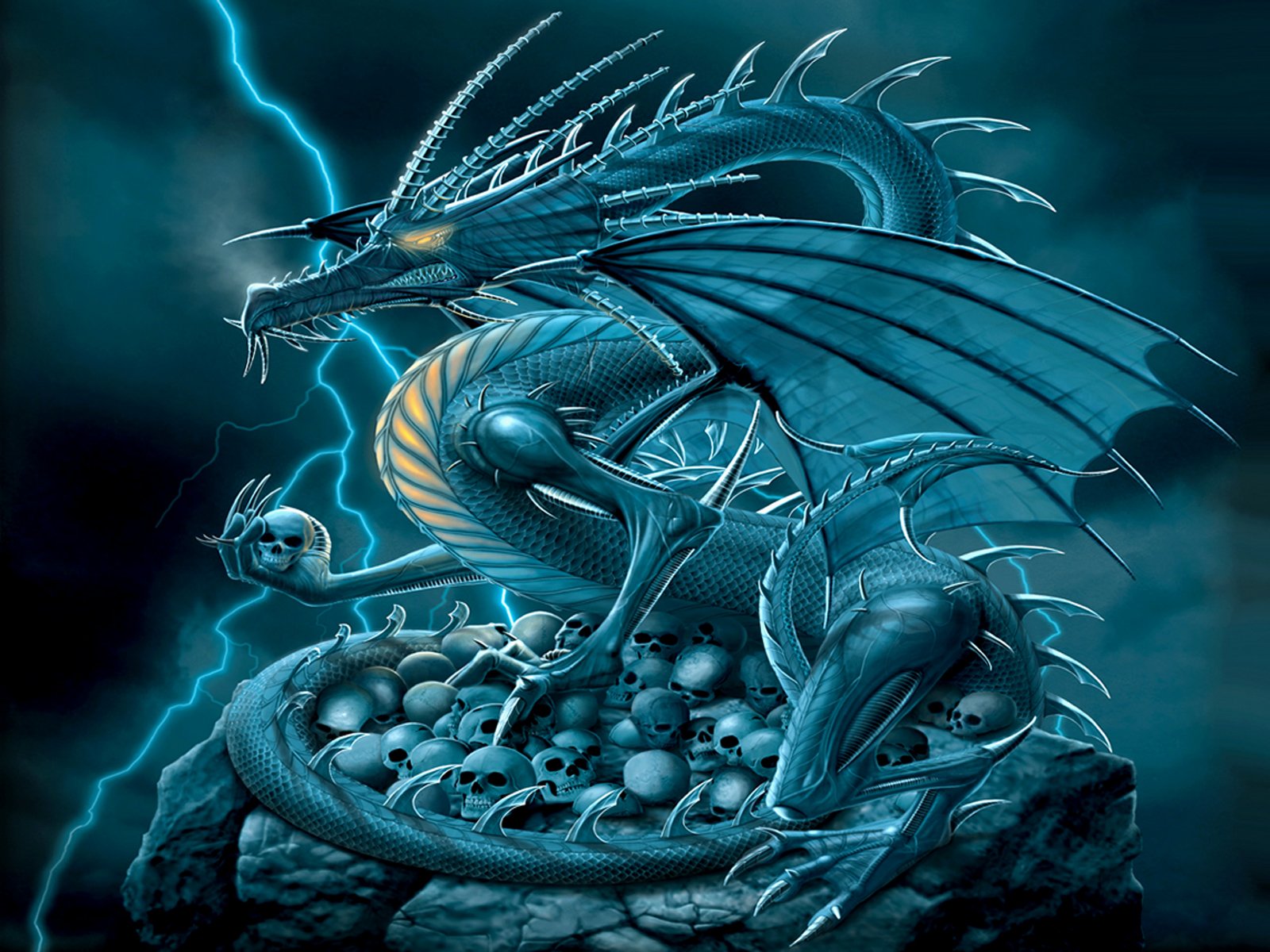 Description: A blue dragon with skulls and bones on a rock with lightning in the background and a skull in the foreground.