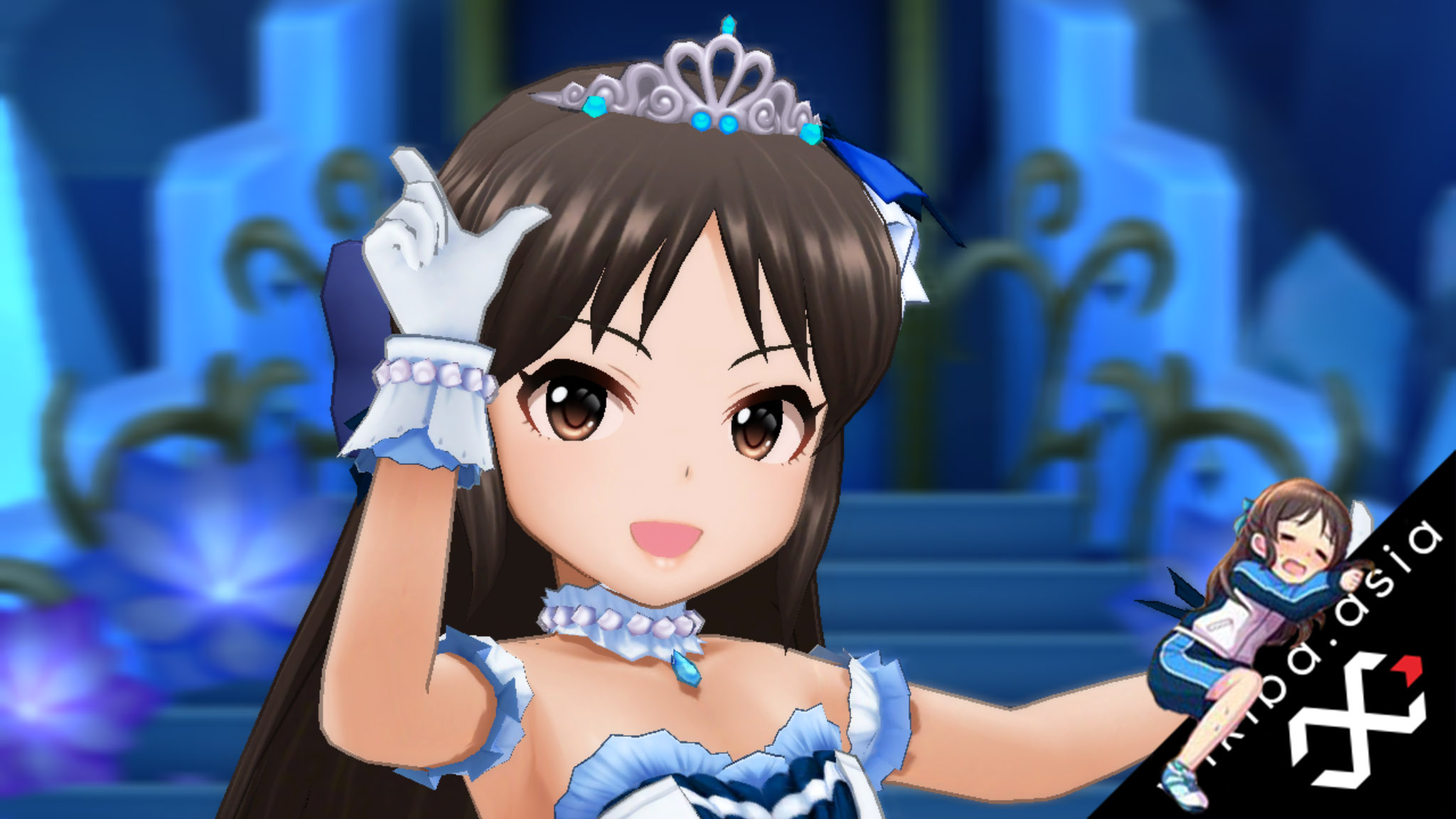 Description: A woman in a blue dress holding a guitar in front of a stage with a blue background and a black guitar.