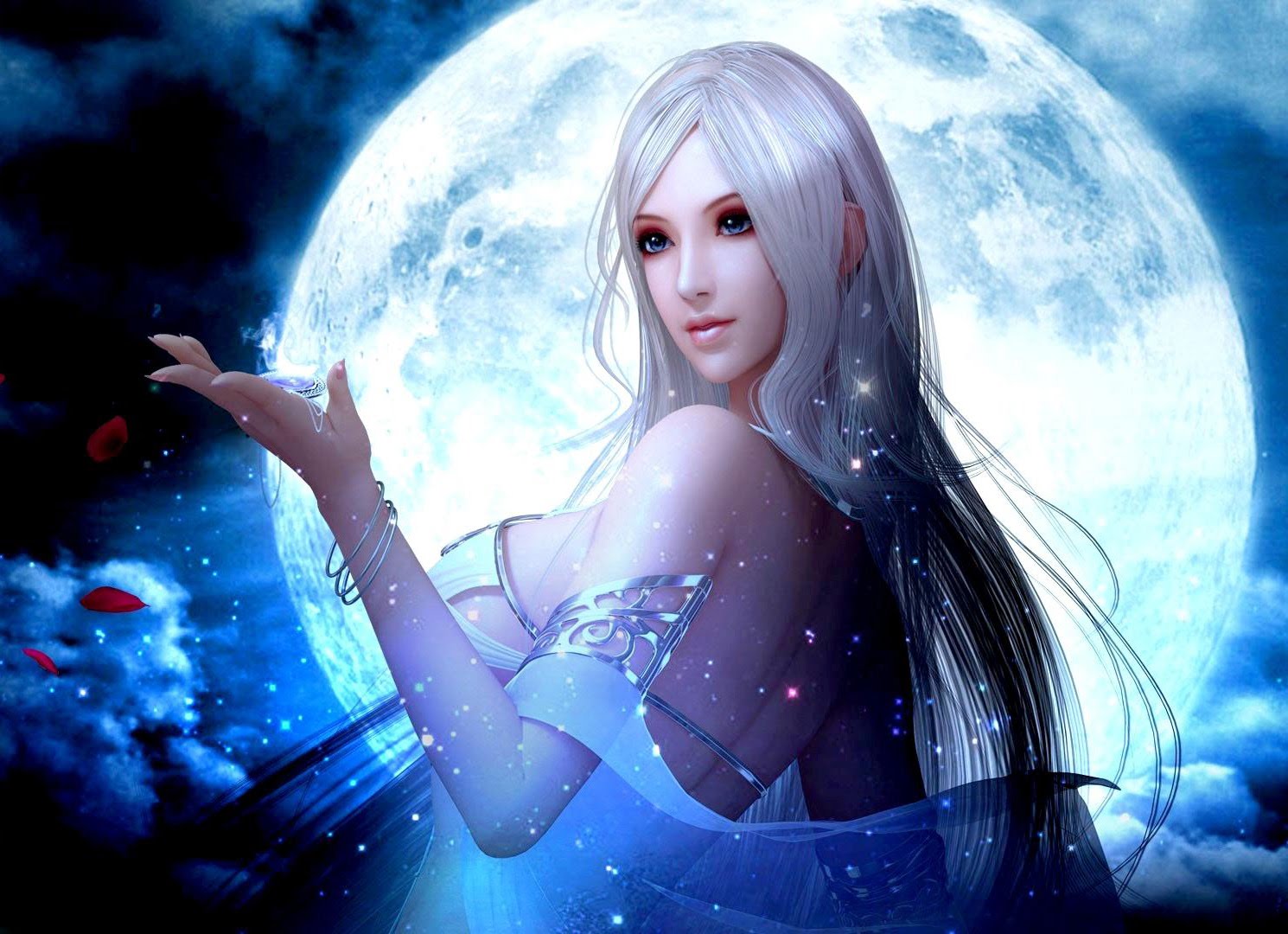 Description: A woman in a blue dress holding a red ball in front of a full moon with stars and clouds.