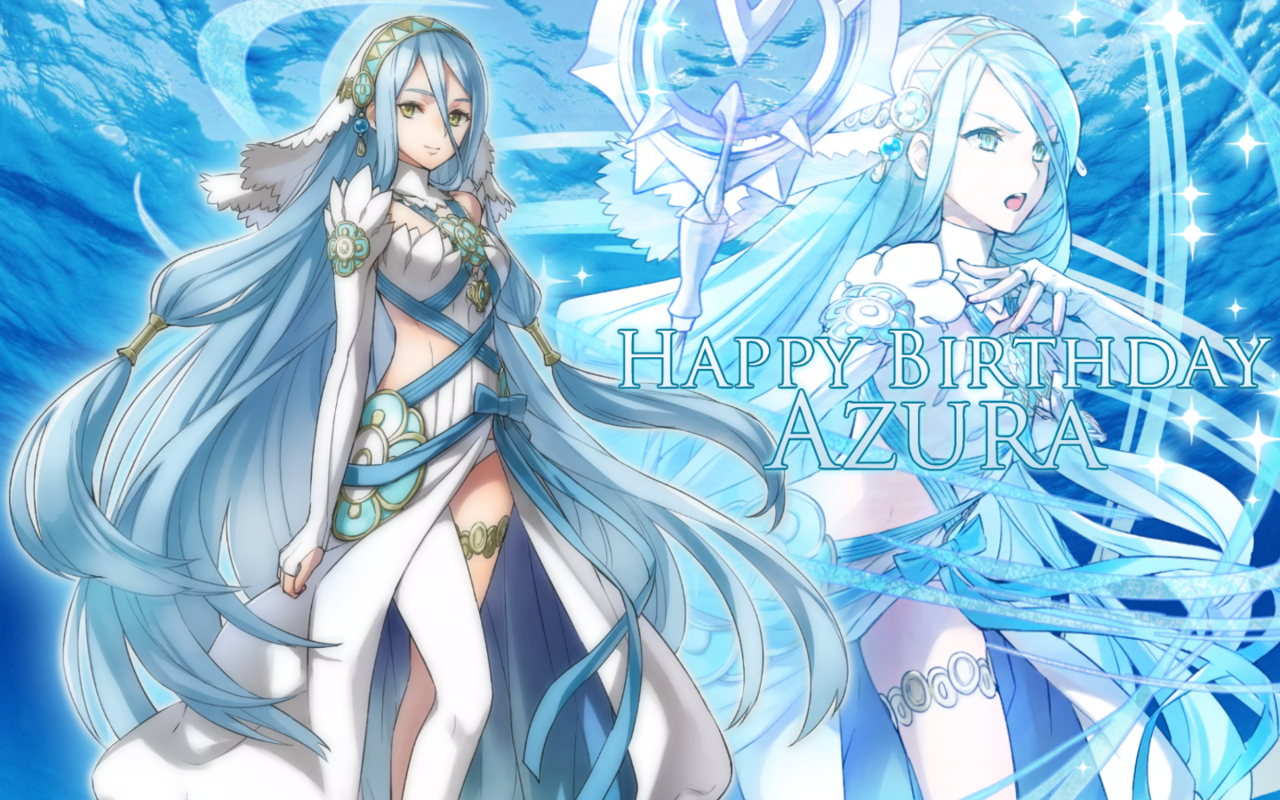 Description: A woman in a blue dress standing next to a man in a white dress and a blue background with a happy birthday azure.